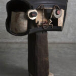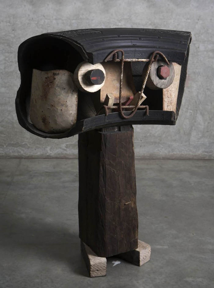 escultura em madeira pintada e objeto de ferro
