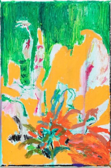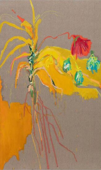 Até o distante ano de 2019, sua produção era eminentemente figurativa, do que é prova Sopro, o trabalho mais antigo desta mostra, um desenho sobre papel realizado com grafite, carvão, bastão oleoso, maçarico, aquarela, acrílica, palo santo (uma madeira peruana que atua como um tipo de carvão), sobre uma folha de papel de 152 x 153 cm. Discrimino o elenco de materiais, para que se tenha noção dos vários procedimentos, dos gestos envolvidos na realização de um corpo retorcido, descarnado, como se a pele lhe tivesse sido arrancada, músculos e ossos percorridos por correntes elétricas, retraindo pés e mãos, obrigando-os a se encontrarem, formando um ponto de convergência, de onde flui uma linha grossa, borrada, que desce até o limite inferior do papel, escapando dele. O desenho/pintura timbra pela sujeira, as cores são intensas, misturam-se, ao passo em que disputam cada centímetro. Há tons de amarelos, azuis, vermelhos, cinzas, brancos e pretos, e eles vêm de cambulhada, amalgamados, mas também esgarçados, com manchas e linhas vibráteis. Aliás, tudo ali vibra, mais não fosse porque linhas e planos são descontínuos, truncados, resultado de um labor incisivo, mas que parece esbarrar numa enorme resistência.
