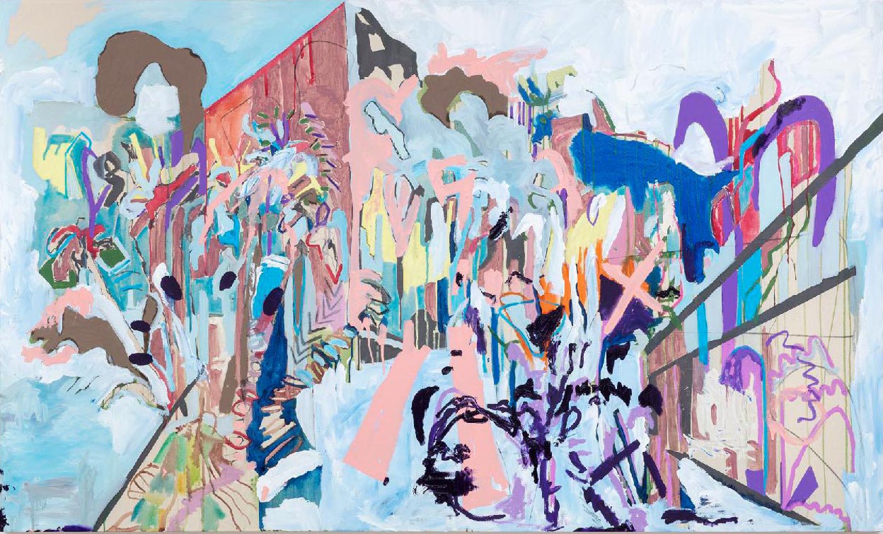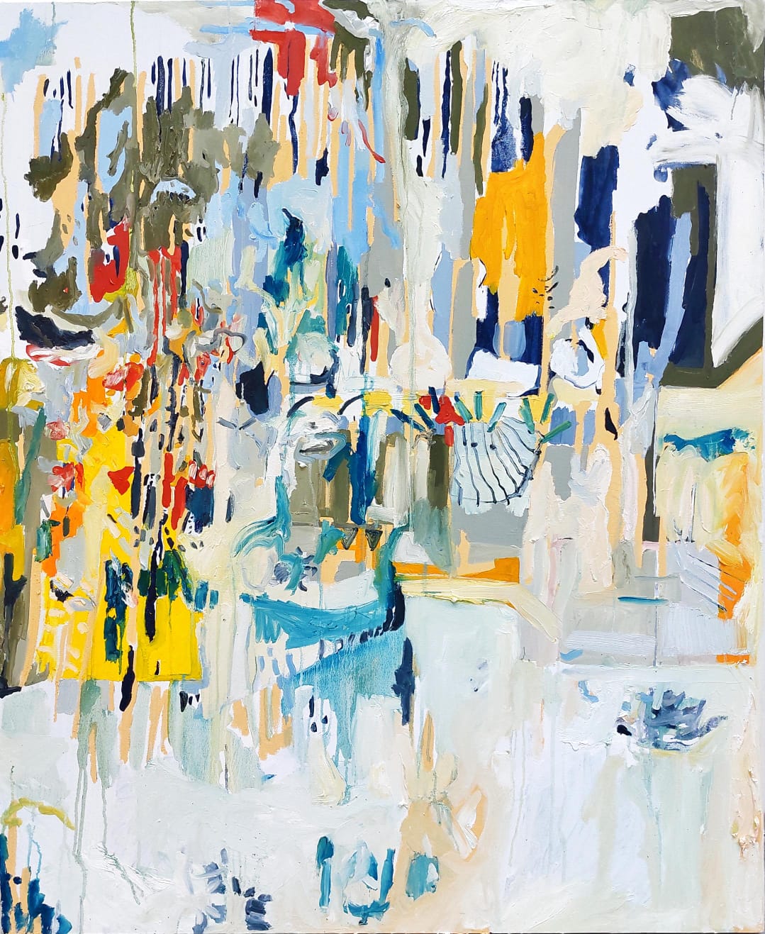 Até o distante ano de 2019, sua produção era eminentemente figurativa, do que é prova Sopro, o trabalho mais antigo desta mostra, um desenho sobre papel realizado com grafite, carvão, bastão oleoso, maçarico, aquarela, acrílica, palo santo (uma madeira peruana que atua como um tipo de carvão), sobre uma folha de papel de 152 x 153 cm. Discrimino o elenco de materiais, para que se tenha noção dos vários procedimentos, dos gestos envolvidos na realização de um corpo retorcido, descarnado, como se a pele lhe tivesse sido arrancada, músculos e ossos percorridos por correntes elétricas, retraindo pés e mãos, obrigando-os a se encontrarem, formando um ponto de convergência, de onde flui uma linha grossa, borrada, que desce até o limite inferior do papel, escapando dele. O desenho/pintura timbra pela sujeira, as cores são intensas, misturam-se, ao passo em que disputam cada centímetro. Há tons de amarelos, azuis, vermelhos, cinzas, brancos e pretos, e eles vêm de cambulhada, amalgamados, mas também esgarçados, com manchas e linhas vibráteis. Aliás, tudo ali vibra, mais não fosse porque linhas e planos são descontínuos, truncados, resultado de um labor incisivo, mas que parece esbarrar numa enorme resistência.
