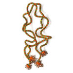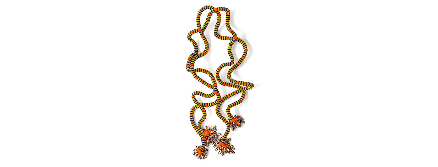 Quanto à religiosidade, é impossível dissociá-la de minha arte; não existe na arte tradicional africana nada isento de religiosidade, nem um utensílio, nem uma máscara, nem objetos de uso do cotidiano. Nada é isento de produção de sentido, de signos que falam dessa religiosidade. A arte de onde me alimento tem a função de unir humano e espírito. Ayé e Orum. Não posso criar sem perpassar por estes lugares conscientemente. Um fio de contas amarelas não é apenas um fio. Durante sua construção, é impossível não reverenciar a doce presença de Oxum e sussurrando dizer: “seja bem-vinda, Ora ye ye o”.