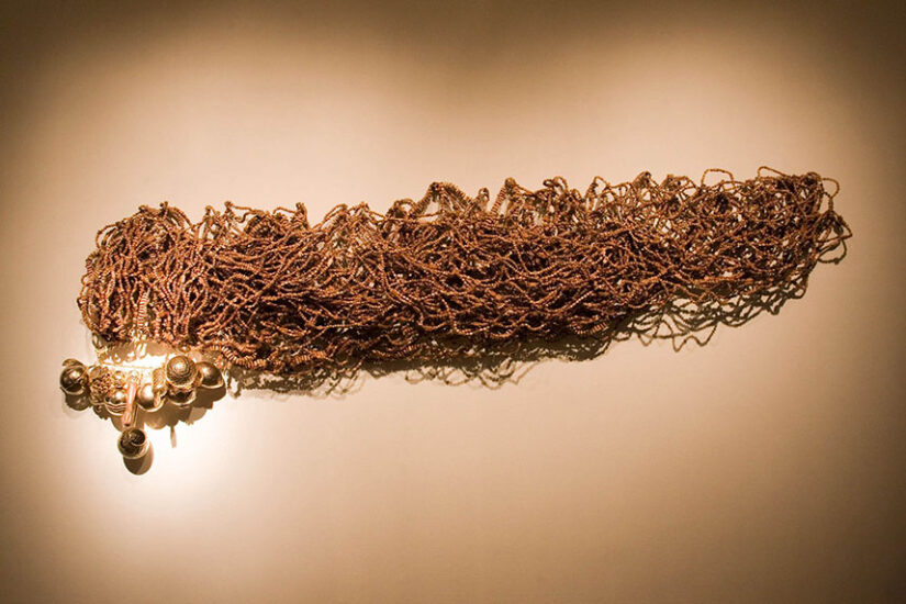 Chama a atenção nesta transposição suas dimensões, de pequenas a grandes, de 8 a 80 metros, e o material – madeira, ouro, prata, contas, cordas, pastilhas de coco, entre outros. Nesta transposição, reside o que você necessita para a visão contemporânea, ou são eles apenas meios para que consiga alcançar sua finalidade estética?
