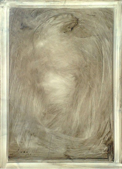 A “Anunciação de 2001” é a mais abstrata de todas. Feita em tons de cinza e em tamanho bem menor, ela guarda uma aura do sagrado e de religião. A composição é gráfica e metafórica, e apenas uma camada de tinta é usada. Não está claro onde está o anjo ou se é Maria. Só o título pode ajudar a decifrar a imagem. Suas pinturas abstratas podem ser consideradas iconoclastas pelo uso da dissimulação das figuras e símbolos, que sugerem, insinuam, subentendem, mas não dizem. Araujo se apropria da técnica do sfumato de Leonardo da Vinci. É difícil saber onde o fundo começa ou acaba. A luta constante entre a ausência física e a presença divina se torna especialmente visível nas telas abstratas.