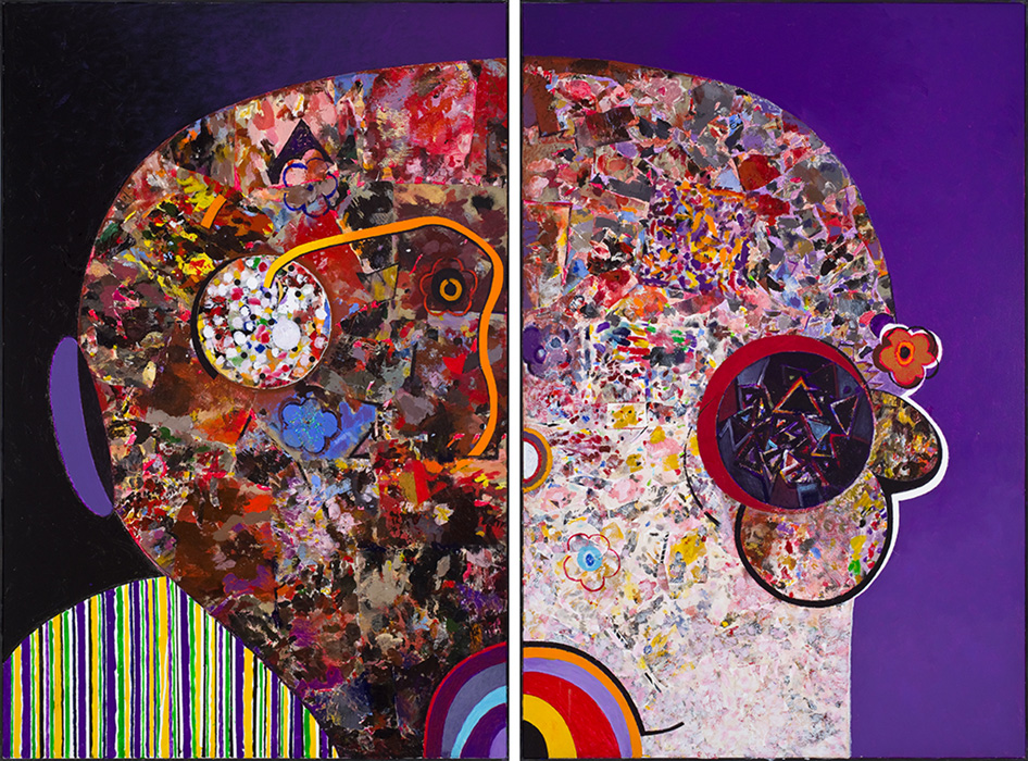 Fernando nesta mesma mostra começa a desconstruir seus construtivos e requintados jogos de armar com sua usual liberdade gráfica da criança lúdica nele habitada. Um exemplo: as pinturas Cabeça e Carrinho de brinquedo, que são como projetos iniciais a serem expandidos e potencializados nesta nova série maravilhosa de pinturas aqui expostas. Toda ela teve como ponto de partida a bi-polarização do cérebro pretendida pela ciência, já que a espiritualidade defende uma unificação para a busca do equilíbrio e da não dualidade. Fernando faz uma entrada de cabeça no seu obscuro e desconhecido mundo, o inconsciente atonal redimensionado. Prevalece, no entanto, não só mais o lado esquemático dividido entre esquerdo e direito, razão e intuição, com a consciência ocidental sempre cindida entre dois polos: bem e mal, preto e branco, negativo e positivo… O artista desenha outra linha de equilíbrio sem dualidades mesmo repartindo algumas obras em duas telas verticais como dípticos e criando situações quase antagônicas. Fernando Coelho diz que entre a agonia e o prazer de criar, tão visceral e dual em um artista, surge das duas telas, uma terceira possibilidade, ou, uma situação adversa e complementar que está somente a depender da imaginação pública.