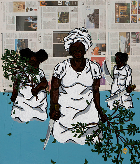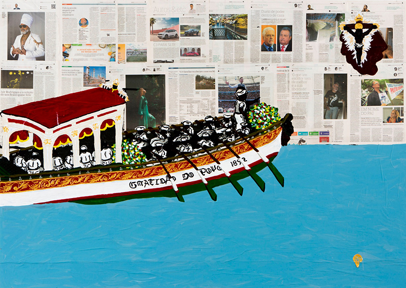 Ao entender a pintura como uma ilha de edição, onde recortes de noticiários e fotografias são elementos predominantes, o artista repete estratégias de montagem para projetar sua prática compositiva. O uso dos jornais como suporte atesta essa “vida das coisas”, tensionando um desejo por expandir o lugar da pintura ao mesmo tempo que, de modo ativo, passam a inserir novas camadas de sentido no que está sendo veiculado. E é preciso ter coragem para afirmar alto que podemos repetir as coisas nos rememora a voz de Édouard Glissant, penso que a repetição é uma das formas de conhecimento do nosso mundo; é repetindo que começamos a ver os indícios de uma novidade que começa a aparecer.