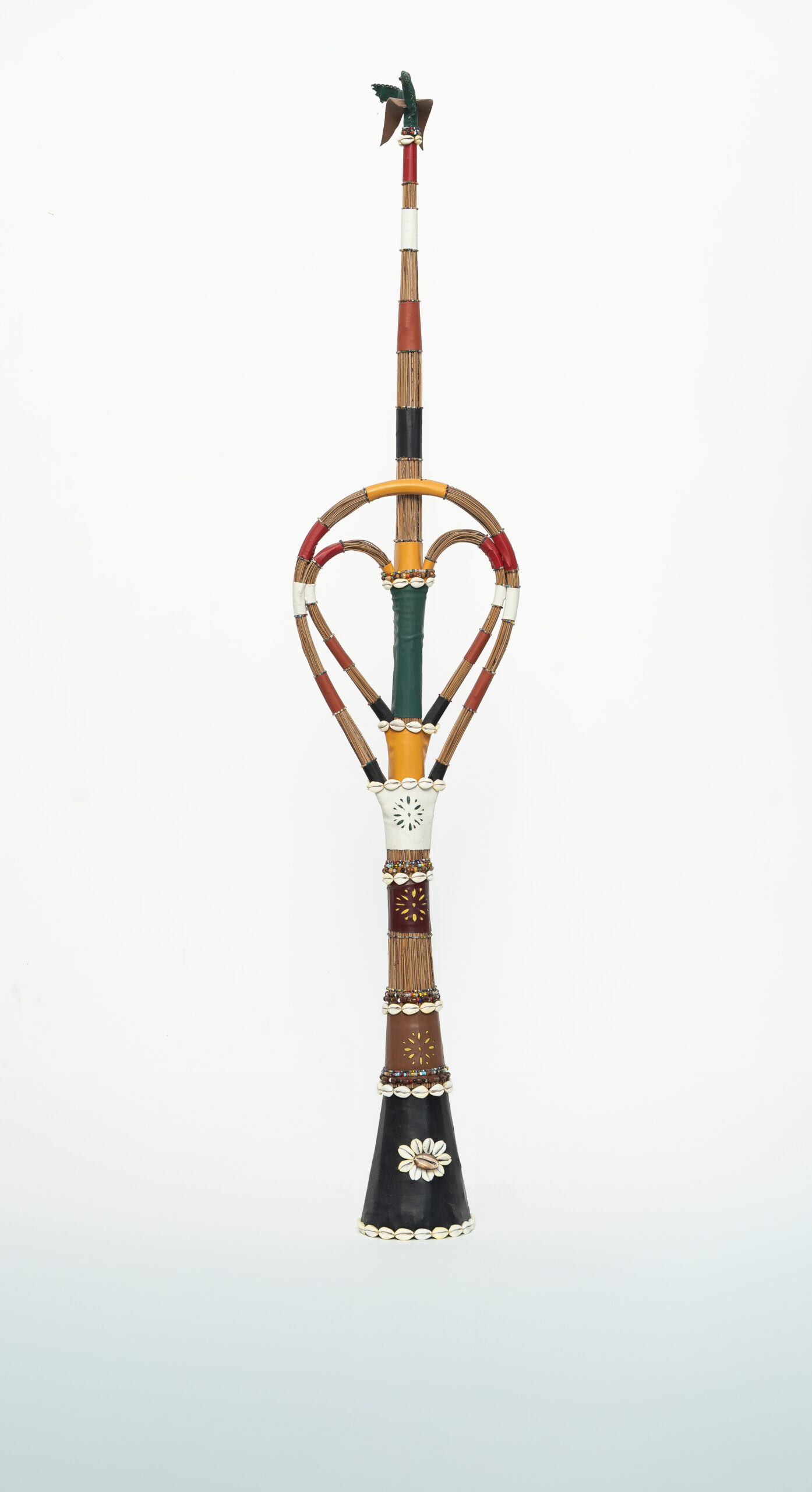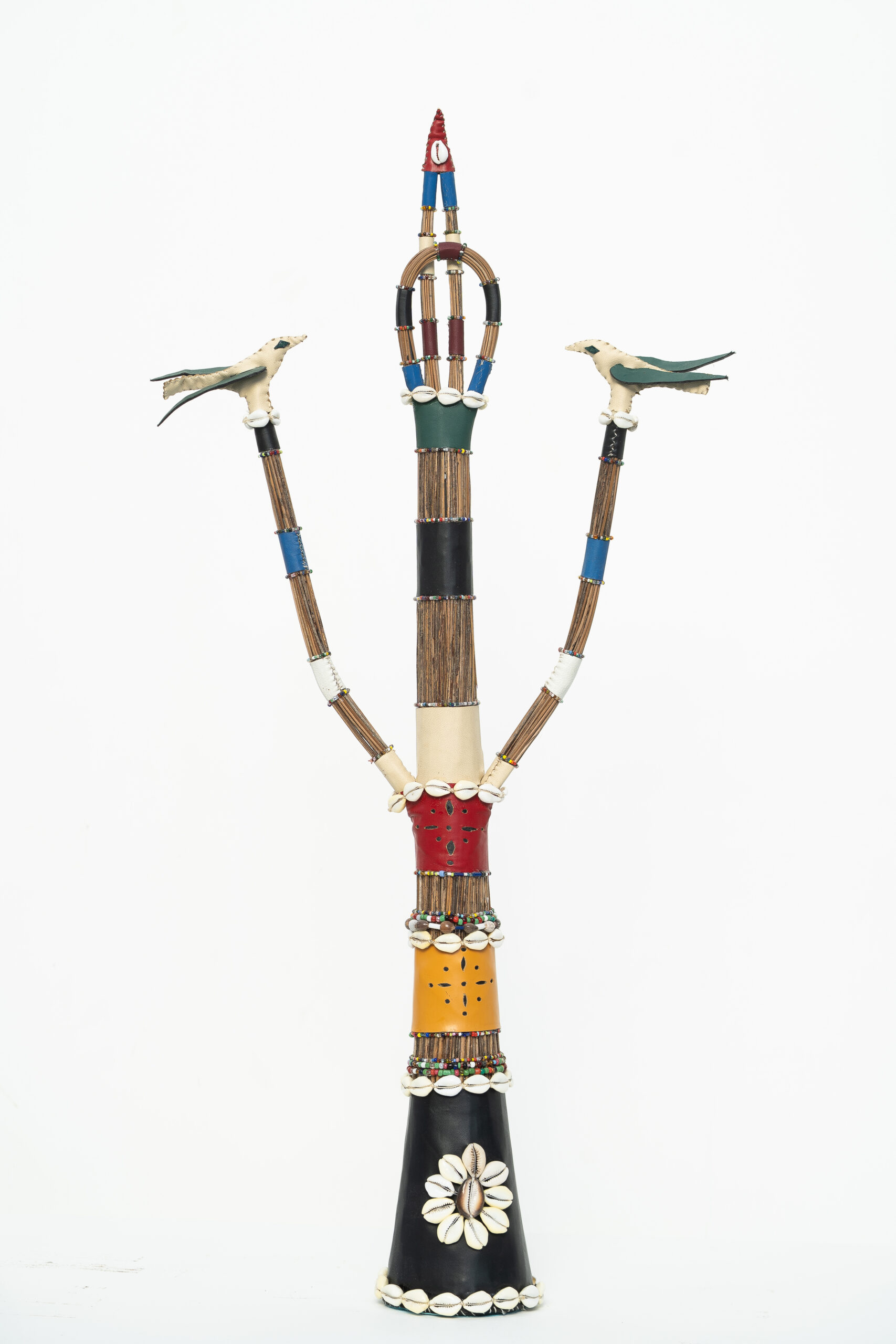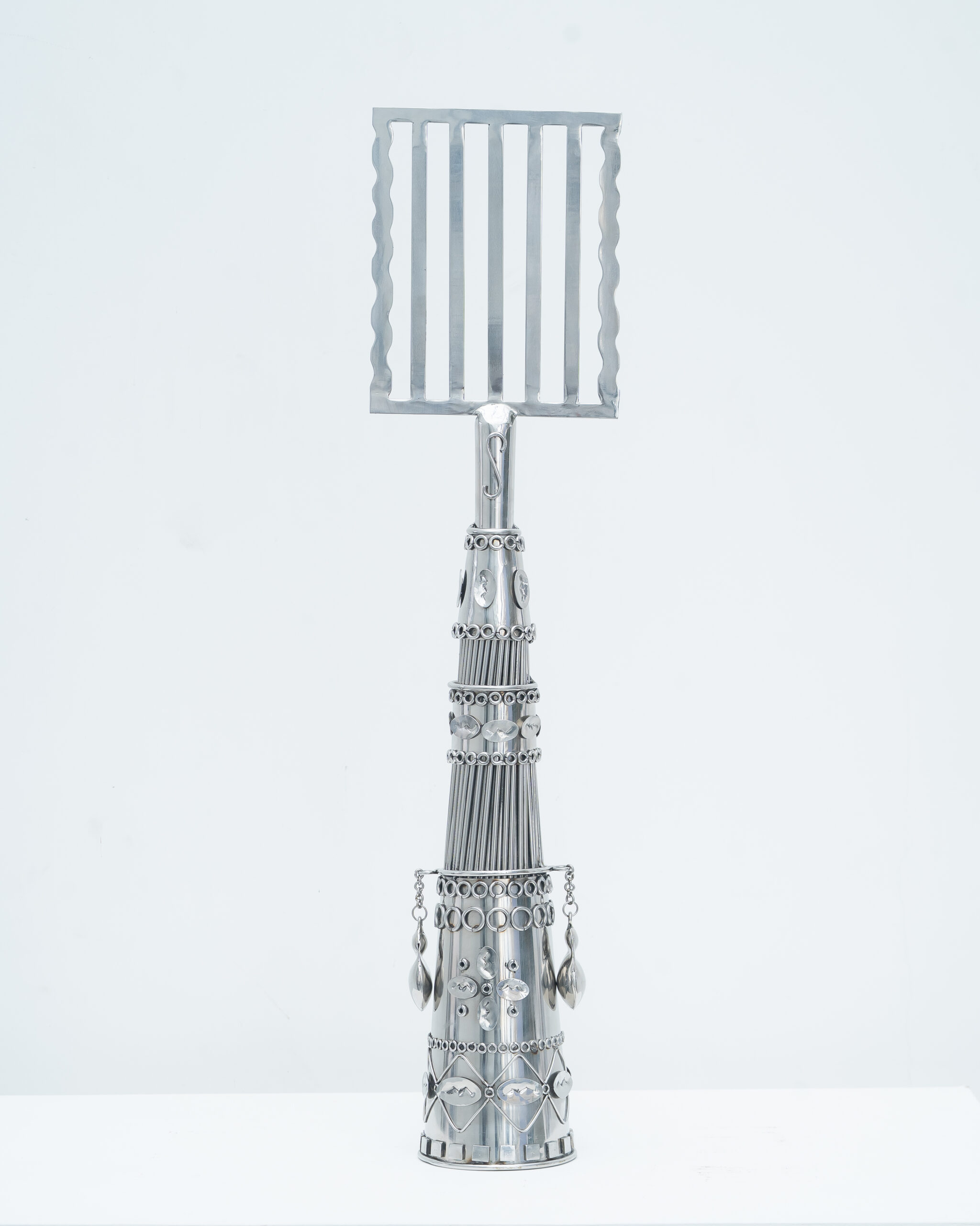 Oríkì é um gênero poético da oralitura iorubá. No plano formal, eles possuem uma composição equilibrada em ritmos repetidos, teses e antíteses, aliterações e assonâncias, que servem como suporte mnemônico. Os oríkì também possuem características bastante específicas do ponto de vista dos seus diversos usos e papéis. O ori (cabeça) e o ki (saudar) evocam jogos verbais ambíguos, geralmente associados ao plano mágico e encantado. No sistema mítico e filosófico africano, os oríkì estabelecem conexões com a ordem do mundo e mobilizam as forças elementares da natureza. Nesse gênero literário, a palavra não tem somente a função de comunicar ou representar. Ela também tem a capacidade de intervir no real, mediar a relação com o divino, apaziguar os mistérios do mundo. A palavra é força. Poder. O oríkì visual é uma ideia formulada a partir do poder encantatório da poesia. Ele se constitui como um elemento que emana energia própria pela sua visualidade. Como objeto, ele tensiona os limites do sagrado, derivando um vigor incomum, como amuleto, que protege as pessoas de infortúnios. A recepção dos oríkì-amuletos aciona e potencializa transmutações profundas, tornando-os fortes tecnologias de cuidados e de curas. No candomblé, juntó é uma junção de dois orixás – um principal, outro complementar – que regem a vida dos indivíduos. Nas minhas esculturas, realizo essa junção me utilizando de símbolos e objetos relacionados às divindades, permitindo assim uma ampla combinação aritmética dos dezesseis principais orixás cultuados no Brasil.