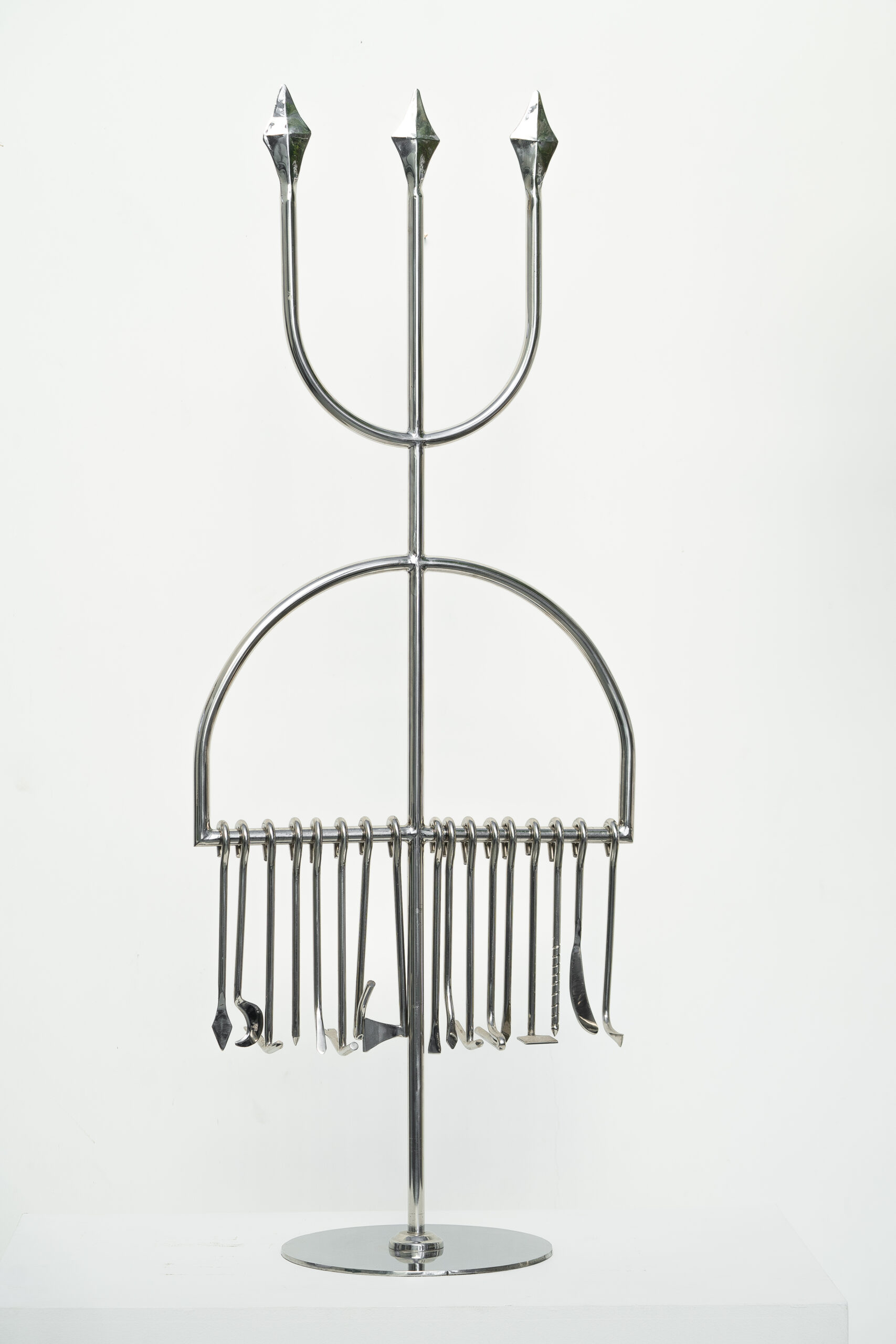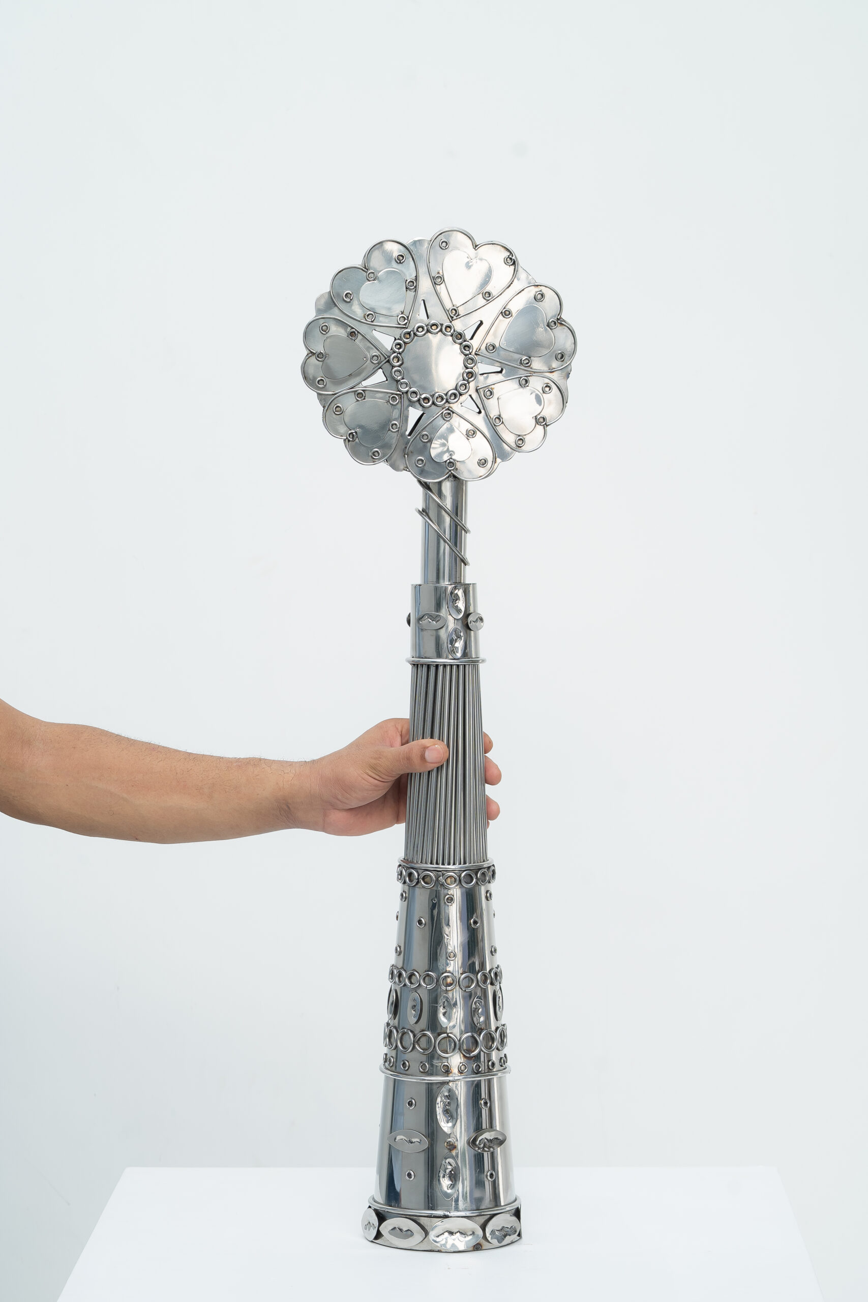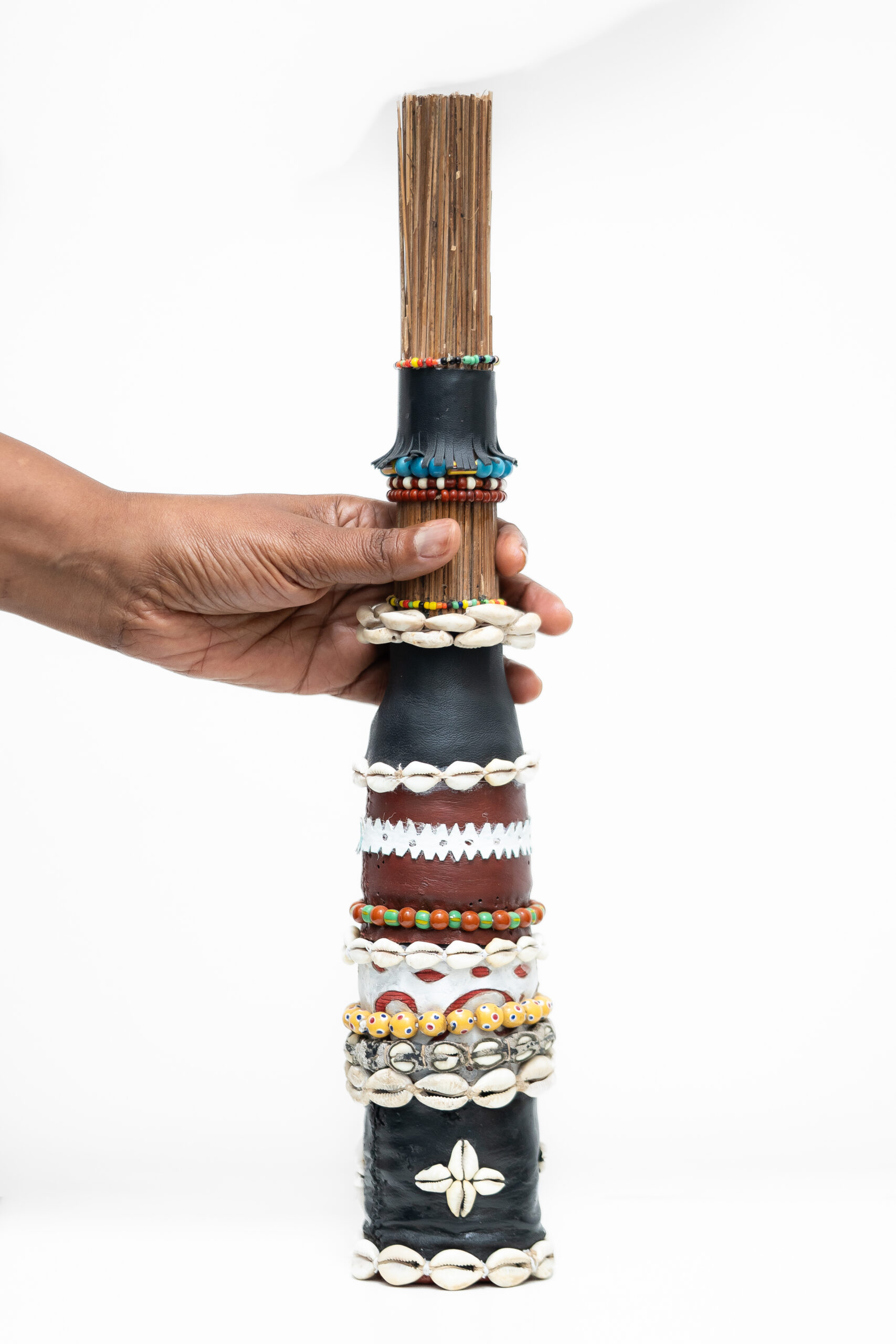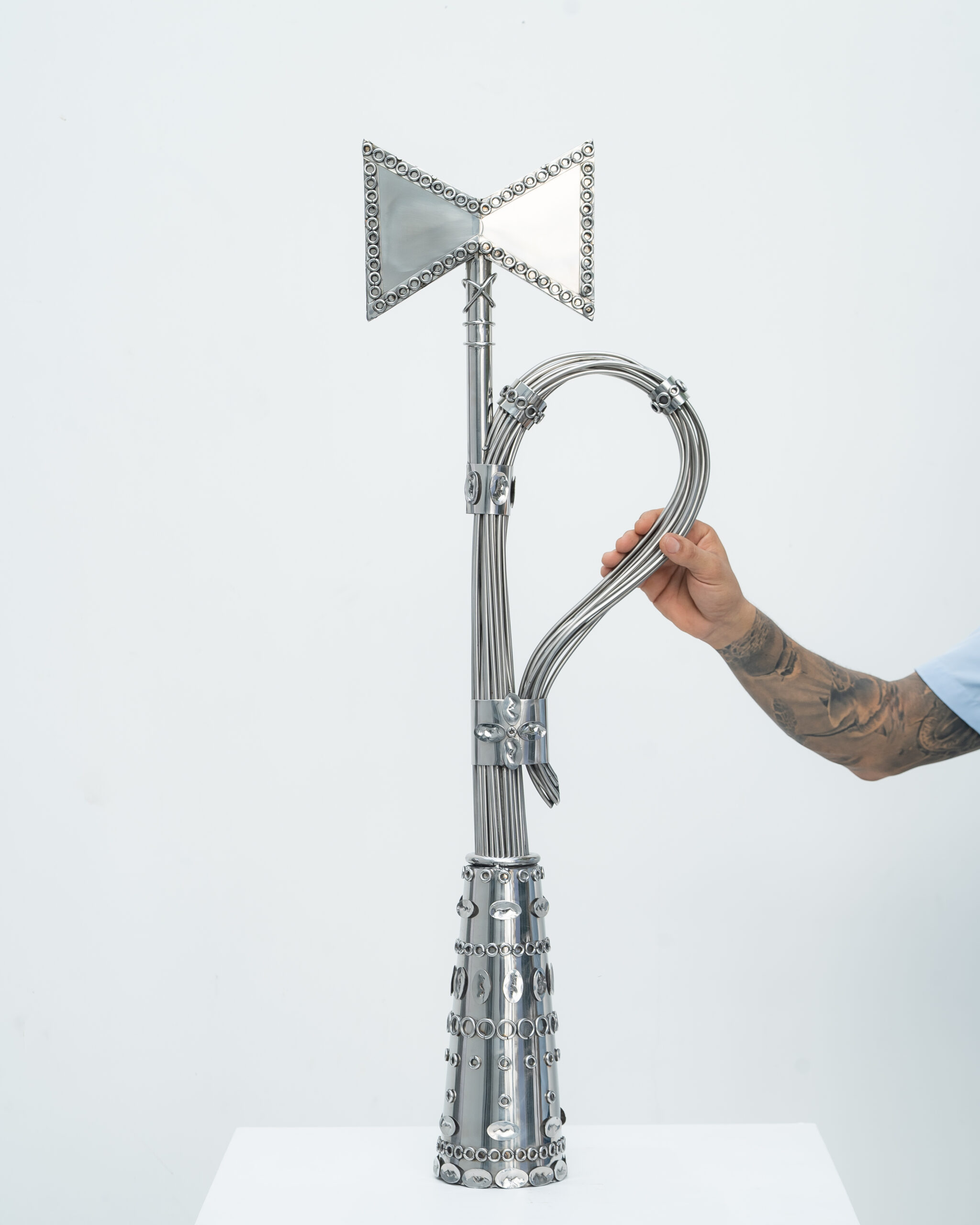Oríkì é um gênero poético da oralitura iorubá. No plano formal, eles possuem uma composição equilibrada em ritmos repetidos, teses e antíteses, aliterações e assonâncias, que servem como suporte mnemônico. Os oríkì também possuem características bastante específicas do ponto de vista dos seus diversos usos e papéis. O ori (cabeça) e o ki (saudar) evocam jogos verbais ambíguos, geralmente associados ao plano mágico e encantado. No sistema mítico e filosófico africano, os oríkì estabelecem conexões com a ordem do mundo e mobilizam as forças elementares da natureza. Nesse gênero literário, a palavra não tem somente a função de comunicar ou representar. Ela também tem a capacidade de intervir no real, mediar a relação com o divino, apaziguar os mistérios do mundo. A palavra é força. Poder. O oríkì visual é uma ideia formulada a partir do poder encantatório da poesia. Ele se constitui como um elemento que emana energia própria pela sua visualidade. Como objeto, ele tensiona os limites do sagrado, derivando um vigor incomum, como amuleto, que protege as pessoas de infortúnios. A recepção dos oríkì-amuletos aciona e potencializa transmutações profundas, tornando-os fortes tecnologias de cuidados e de curas. No candomblé, juntó é uma junção de dois orixás – um principal, outro complementar – que regem a vida dos indivíduos. Nas minhas esculturas, realizo essa junção me utilizando de símbolos e objetos relacionados às divindades, permitindo assim uma ampla combinação aritmética dos dezesseis principais orixás cultuados no Brasil.