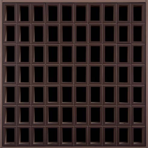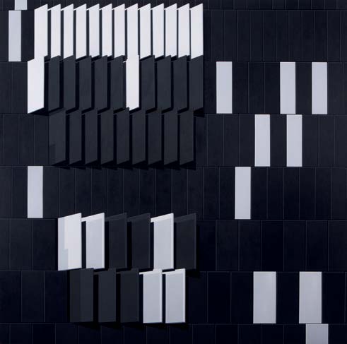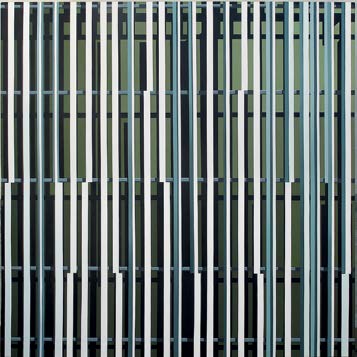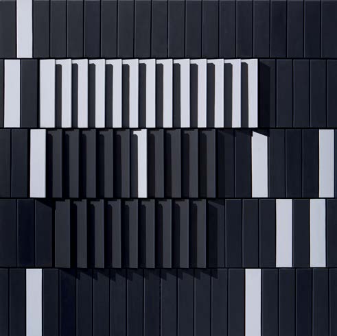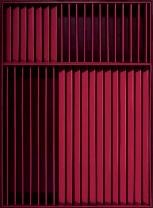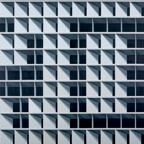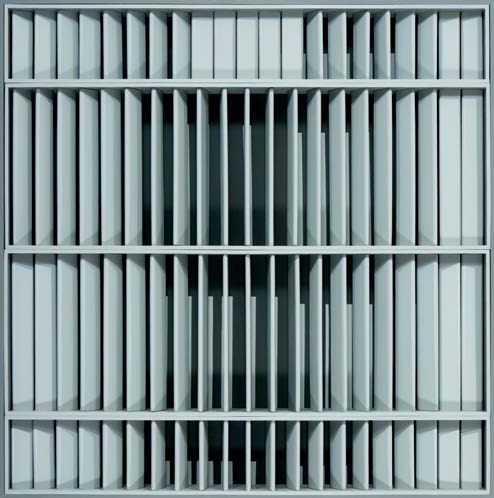 Em Brasília, Hildebrando capturou um enigma que, por anos, atravessou seu trabalho. Agora, os encontros no espaço são revirados e decantados. Esse ponto de partida – e de assombro – é fulcral para o que se revela em Construção: não há encontro no espaço que não seja revirado pelo olhar. Não há luz ou reta que não diga também de um lugar hiperbólico ou de perplexidade. Não há luz sem sombra, e é sobre e sob esta premissa que, na série de pinturas e relevos expostos, o artista utiliza composições geométricas extraídas de recortes da arquitetura e constrói uma obra que, além da representação, cria uma espécie de vertigem entre o bidimensional e o tridimensional.