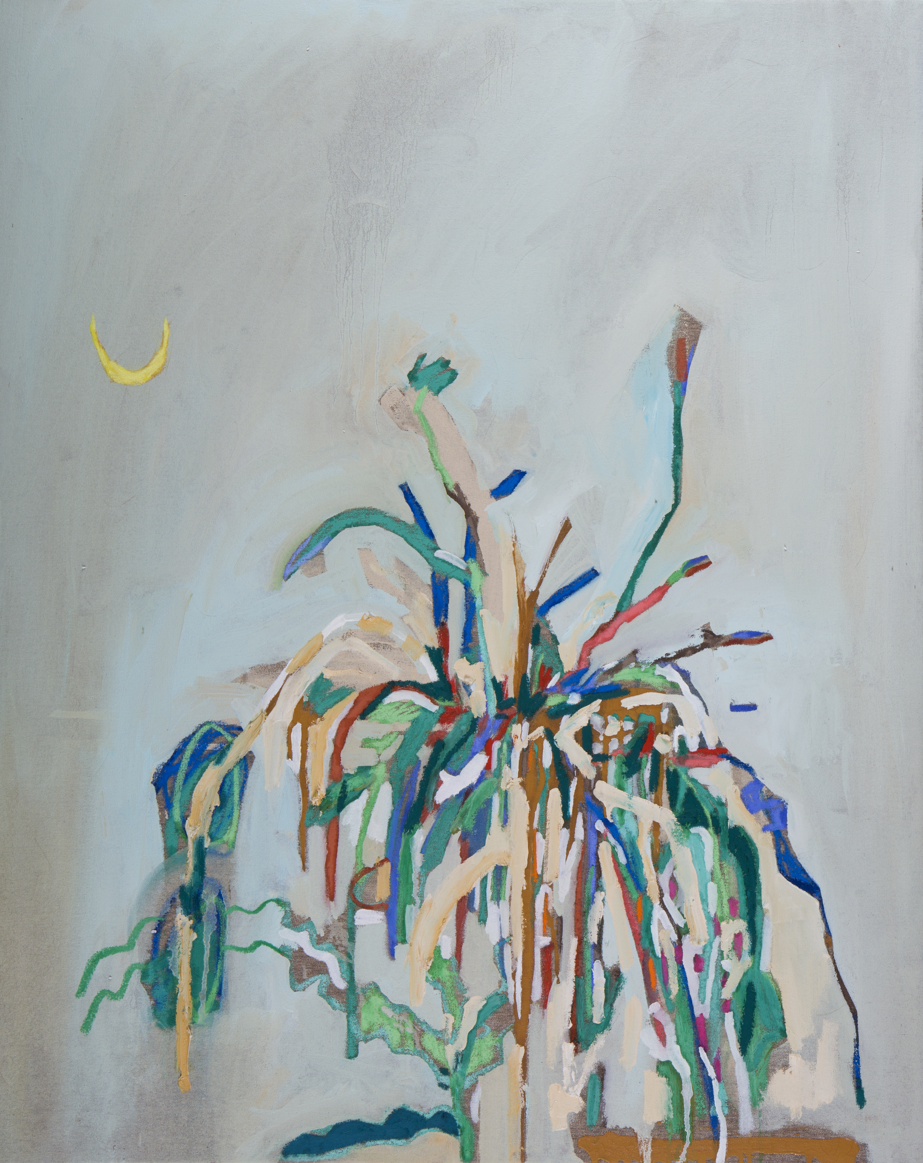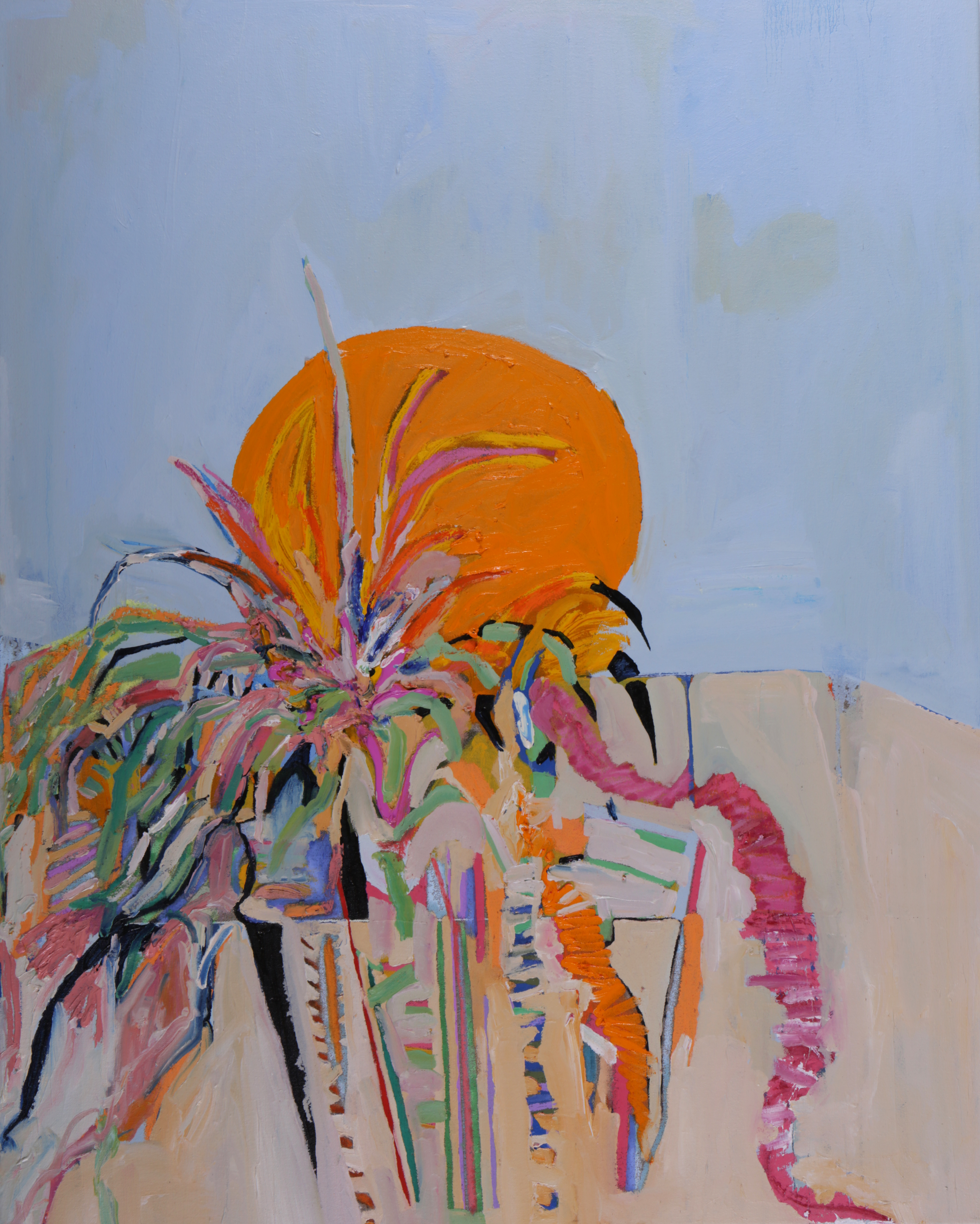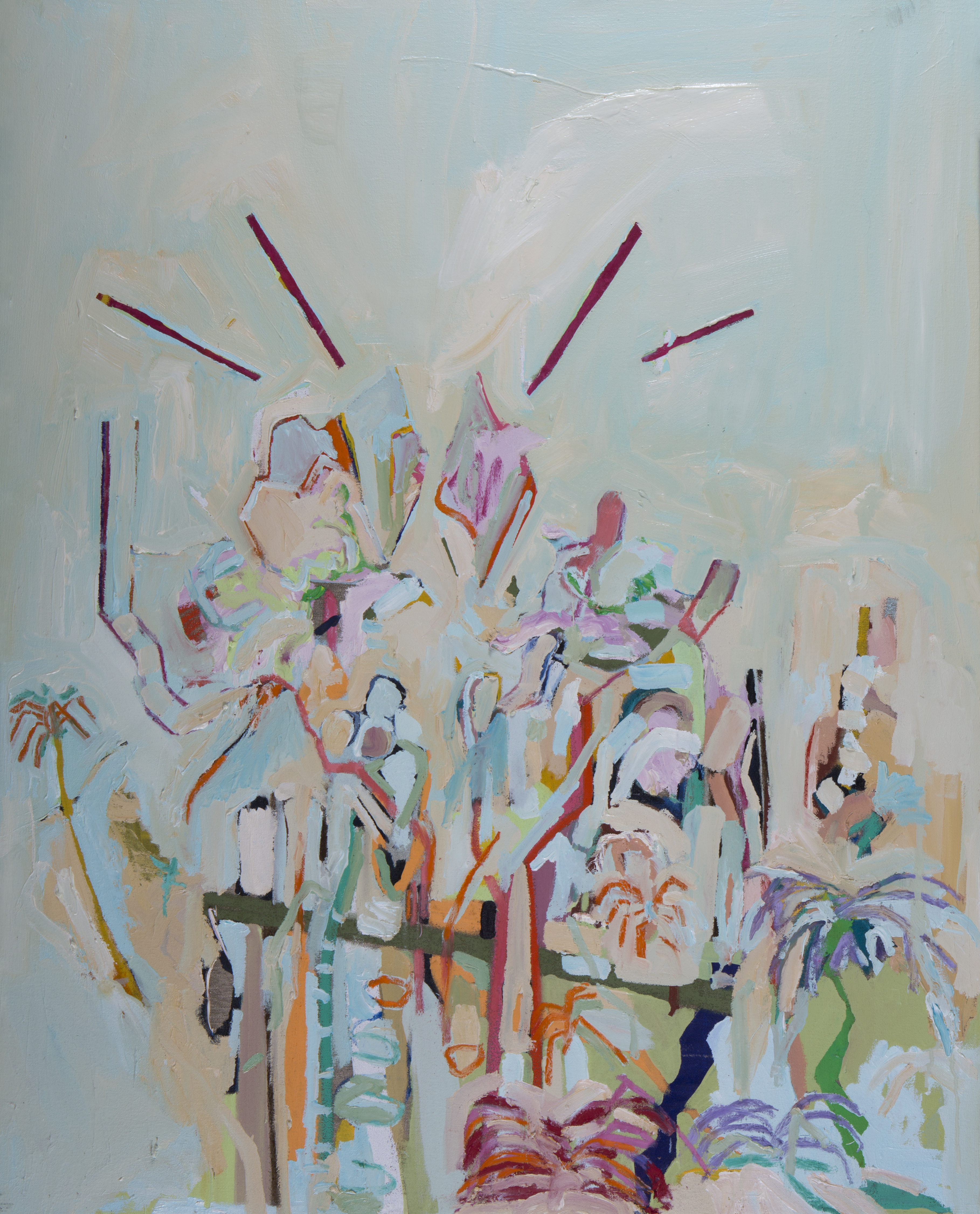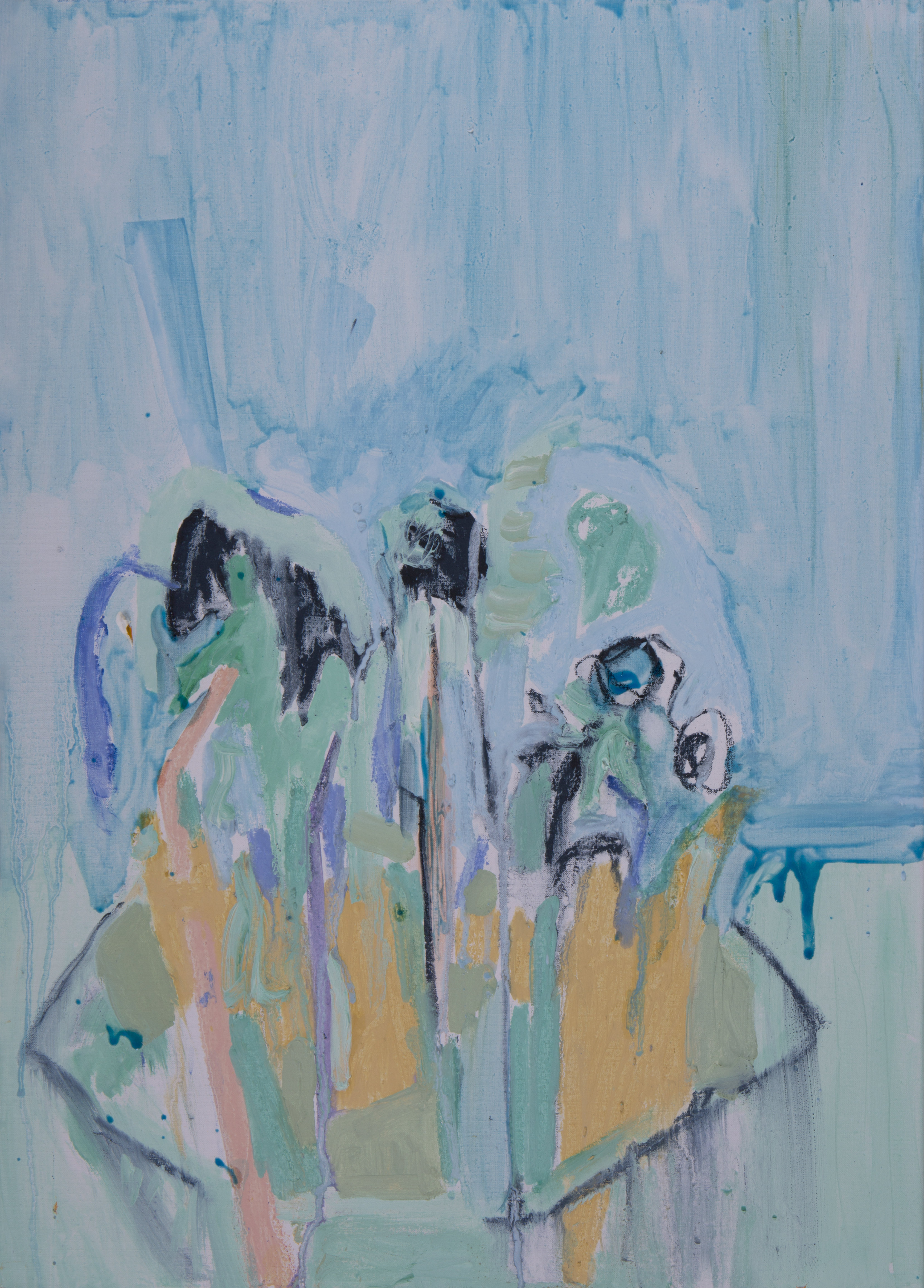 Da primeira “direção”, se origina um grupo de trabalhos colorido, exuberante e luminoso, cujos títulos trazem alusão a topônimos (Barra, Casa da Mãe), gestos (Batuque), elementos (Oferenda, Barbalho e Lírios) e músicas (Anos Blues). São pinturas que pinçam elementos da natureza morta, paisagem, retratos e outros gêneros pictóricos, combinando os mesmos com elementos pictóricos puros, como massas de tinta, texturas e pinceladas. Em algumas, como Casa de Mãe e Barra, parece existir uma certa sugestão de atmosfera, talvez em função do emprego de uma pincelada mais lisa e do amplo emprego dos azuis e suas tonalidades, cores que sugerem espaços infinitos. A artista, não se prendendo a nenhum tipo de mimetismo, acaba chegando no atmosférico por meio de sua essência: sugerindo profundidade e abertura. No caso da segunda, ainda que existam elementos de ordem mais “tectônica”, como alguns signos brancos na parte superior da tela, o predomínio é de uma sinfonia azulada, que vai do cerúleo ao turquesa, com alguns poucos vestígios botânicos que vicejam pela tela.