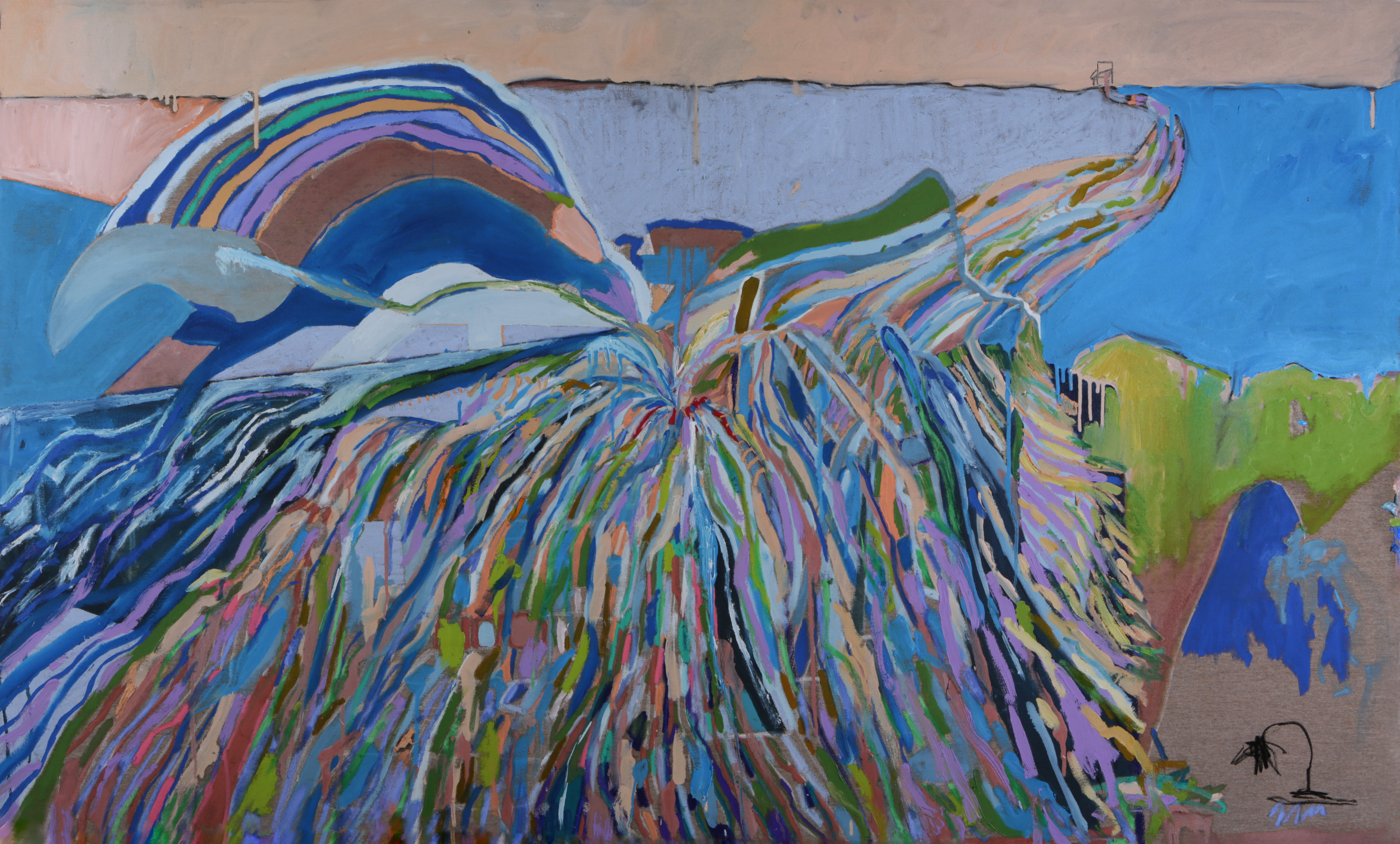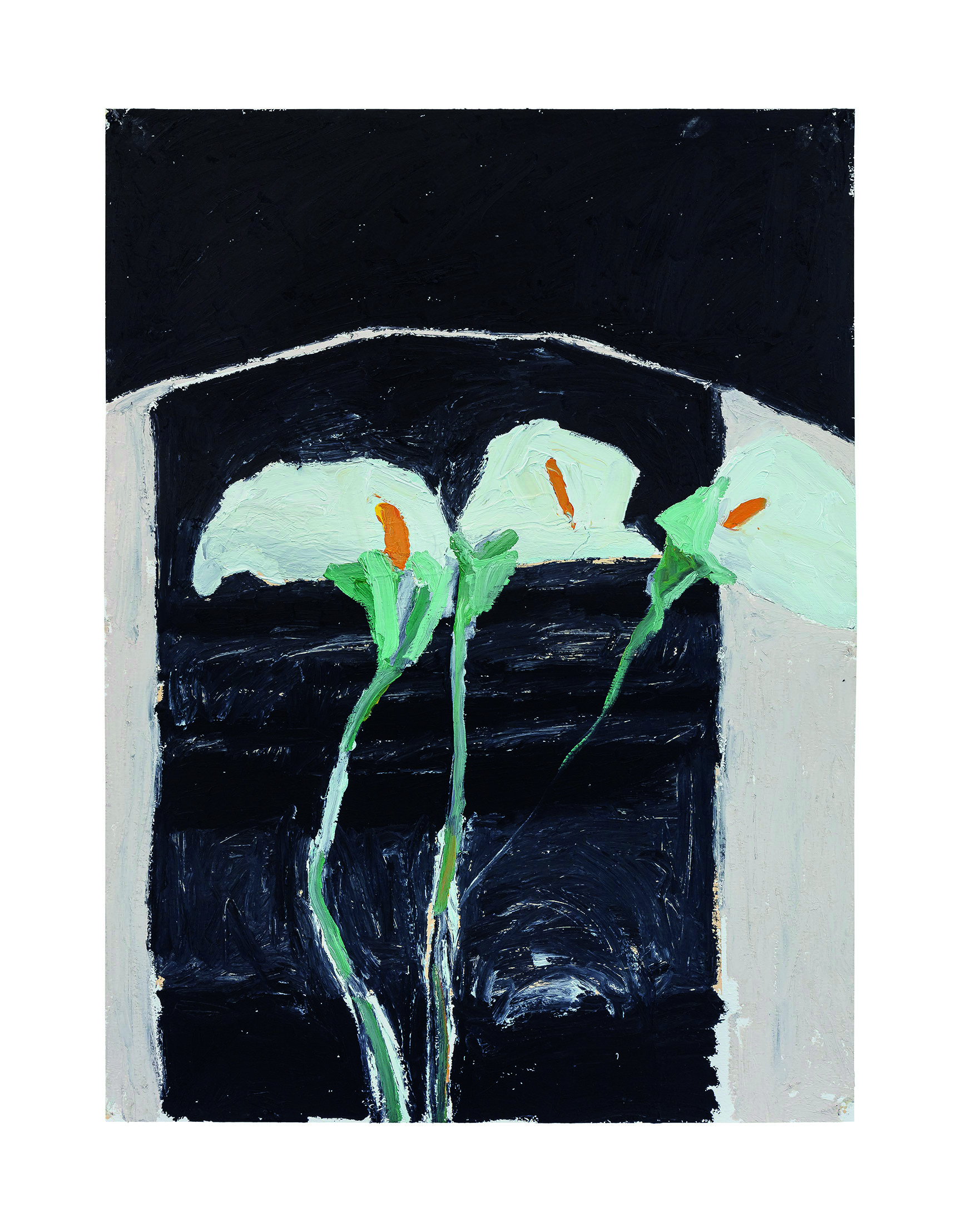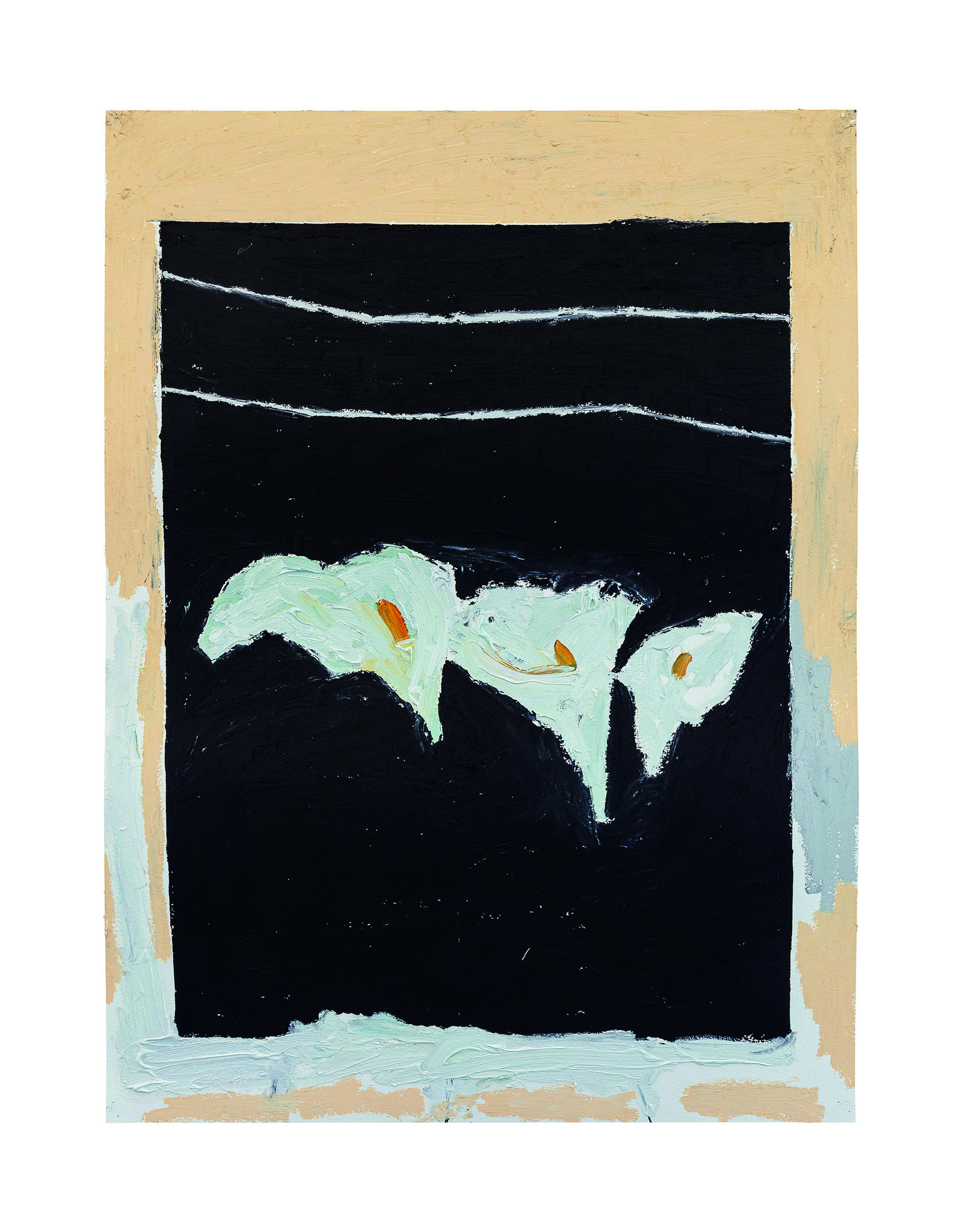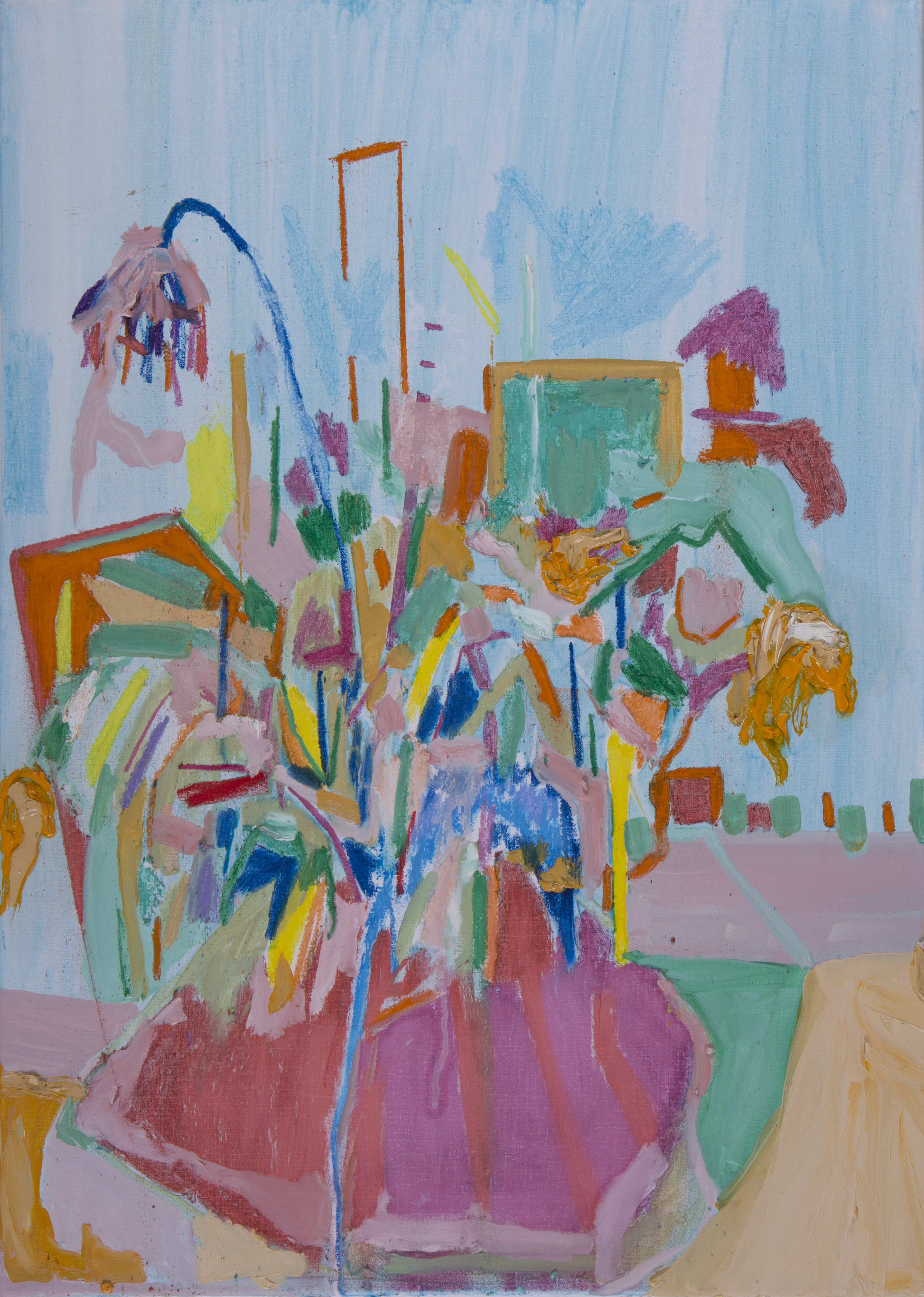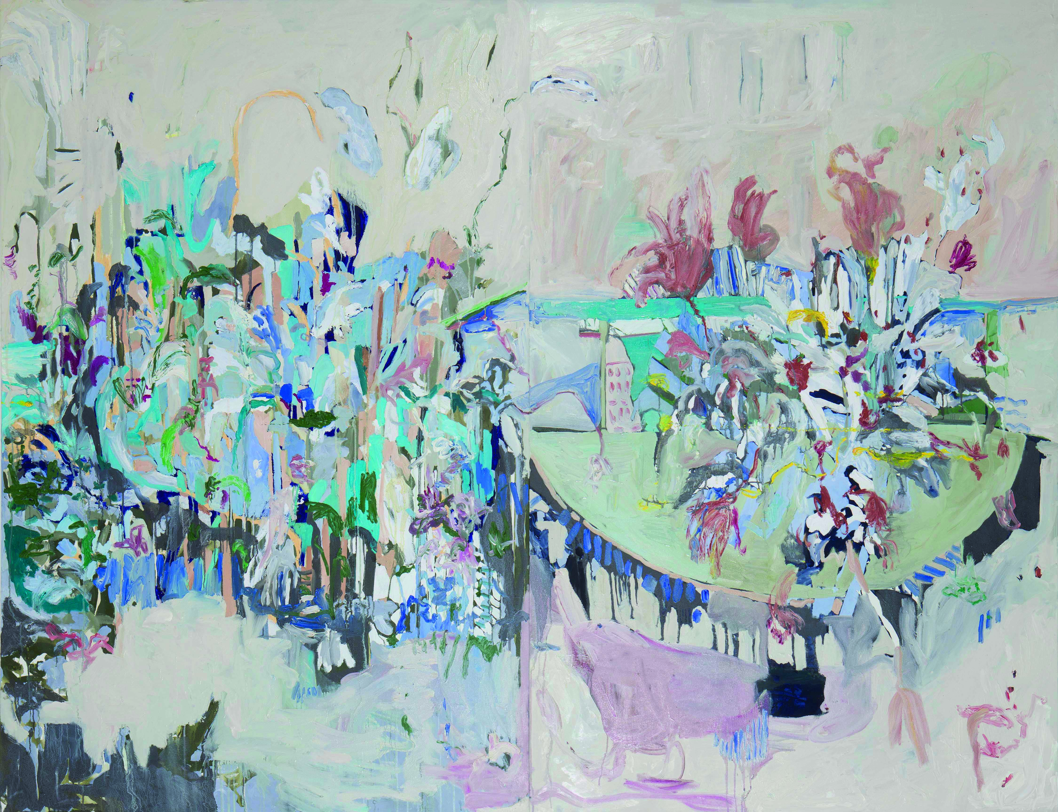 Da primeira “direção”, se origina um grupo de trabalhos colorido, exuberante e luminoso, cujos títulos trazem alusão a topônimos (Barra, Casa da Mãe), gestos (Batuque), elementos (Oferenda, Barbalho e Lírios) e músicas (Anos Blues). São pinturas que pinçam elementos da natureza morta, paisagem, retratos e outros gêneros pictóricos, combinando os mesmos com elementos pictóricos puros, como massas de tinta, texturas e pinceladas. Em algumas, como Casa de Mãe e Barra, parece existir uma certa sugestão de atmosfera, talvez em função do emprego de uma pincelada mais lisa e do amplo emprego dos azuis e suas tonalidades, cores que sugerem espaços infinitos. A artista, não se prendendo a nenhum tipo de mimetismo, acaba chegando no atmosférico por meio de sua essência: sugerindo profundidade e abertura. No caso da segunda, ainda que existam elementos de ordem mais “tectônica”, como alguns signos brancos na parte superior da tela, o predomínio é de uma sinfonia azulada, que vai do cerúleo ao turquesa, com alguns poucos vestígios botânicos que vicejam pela tela.