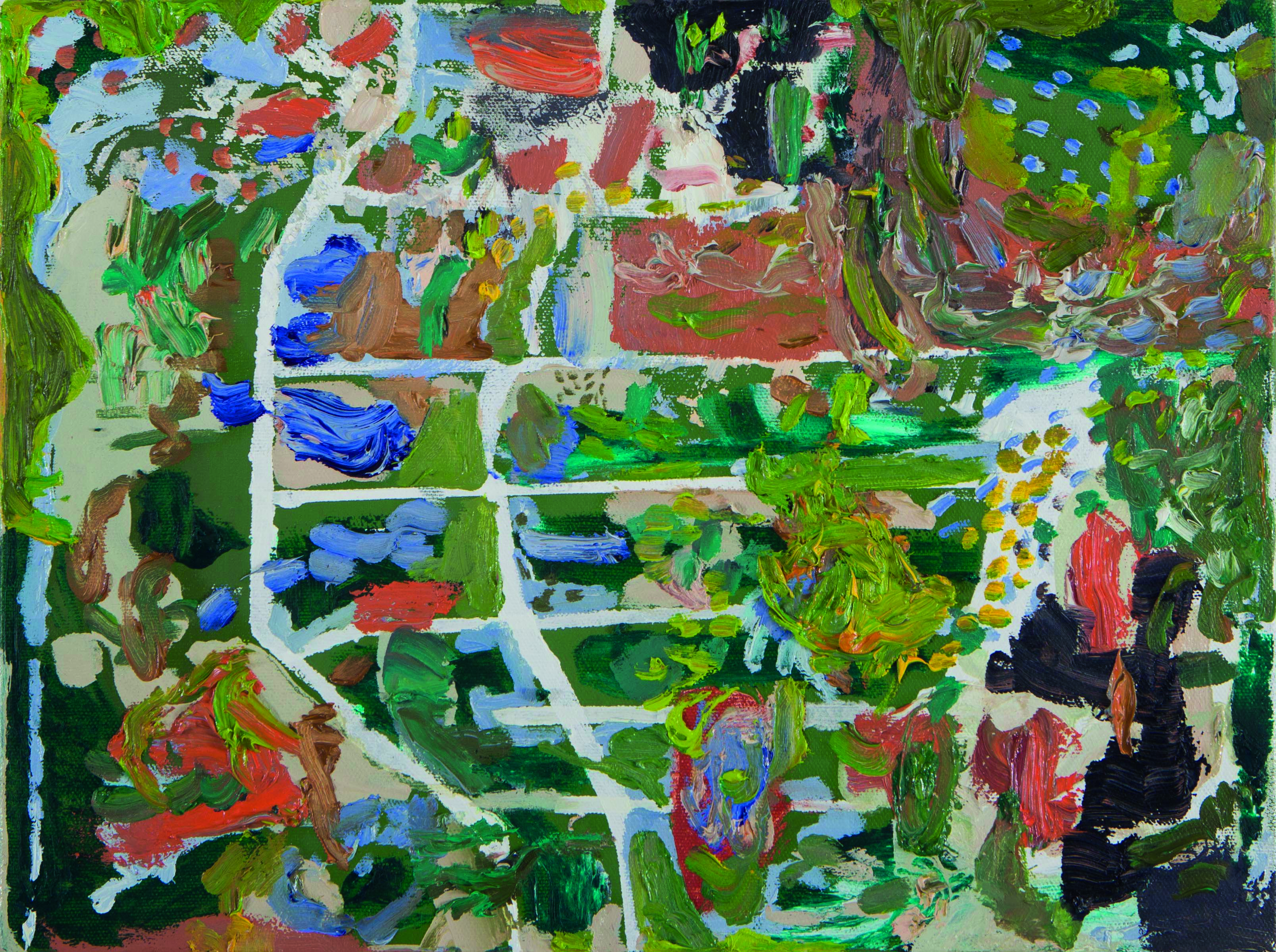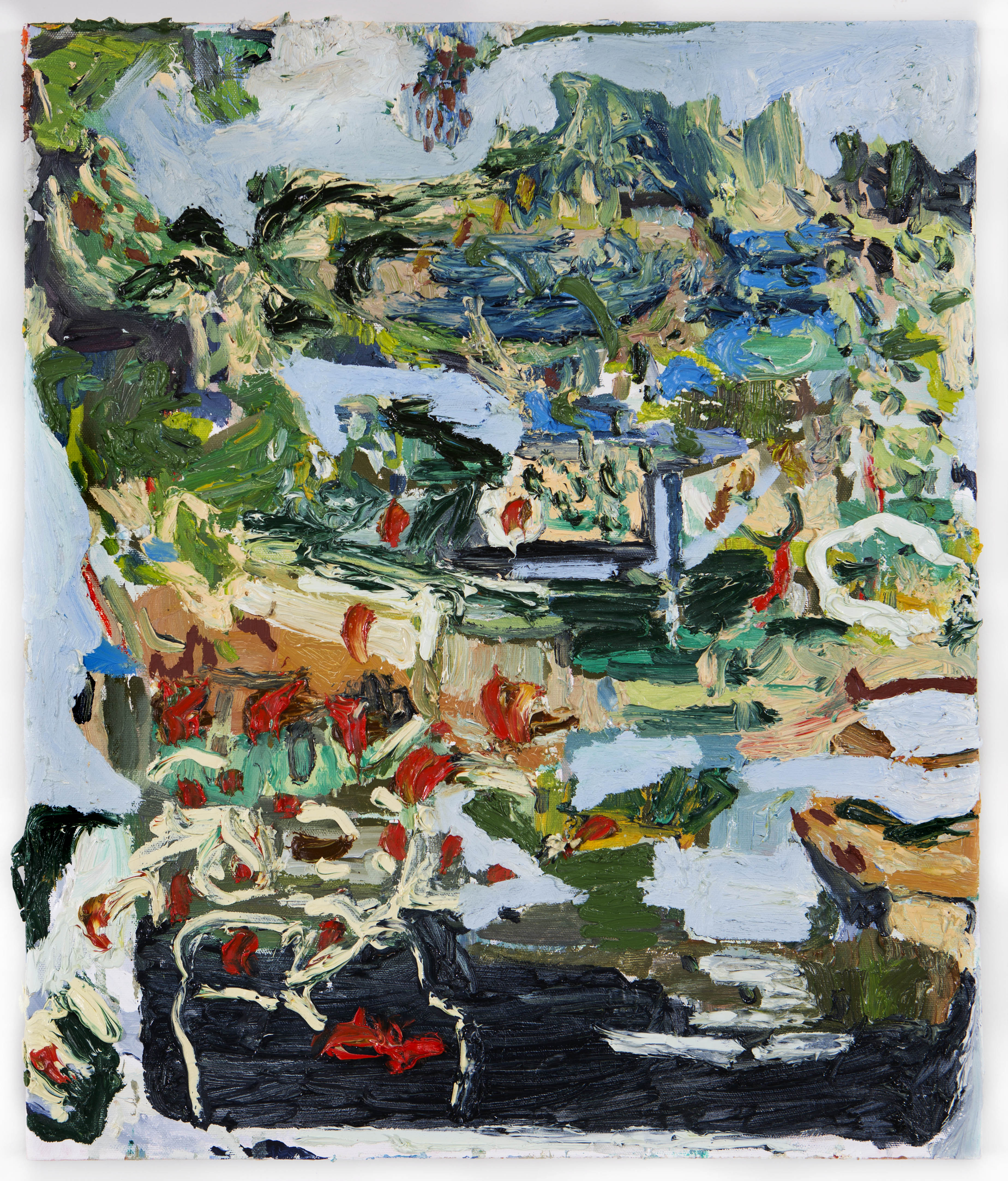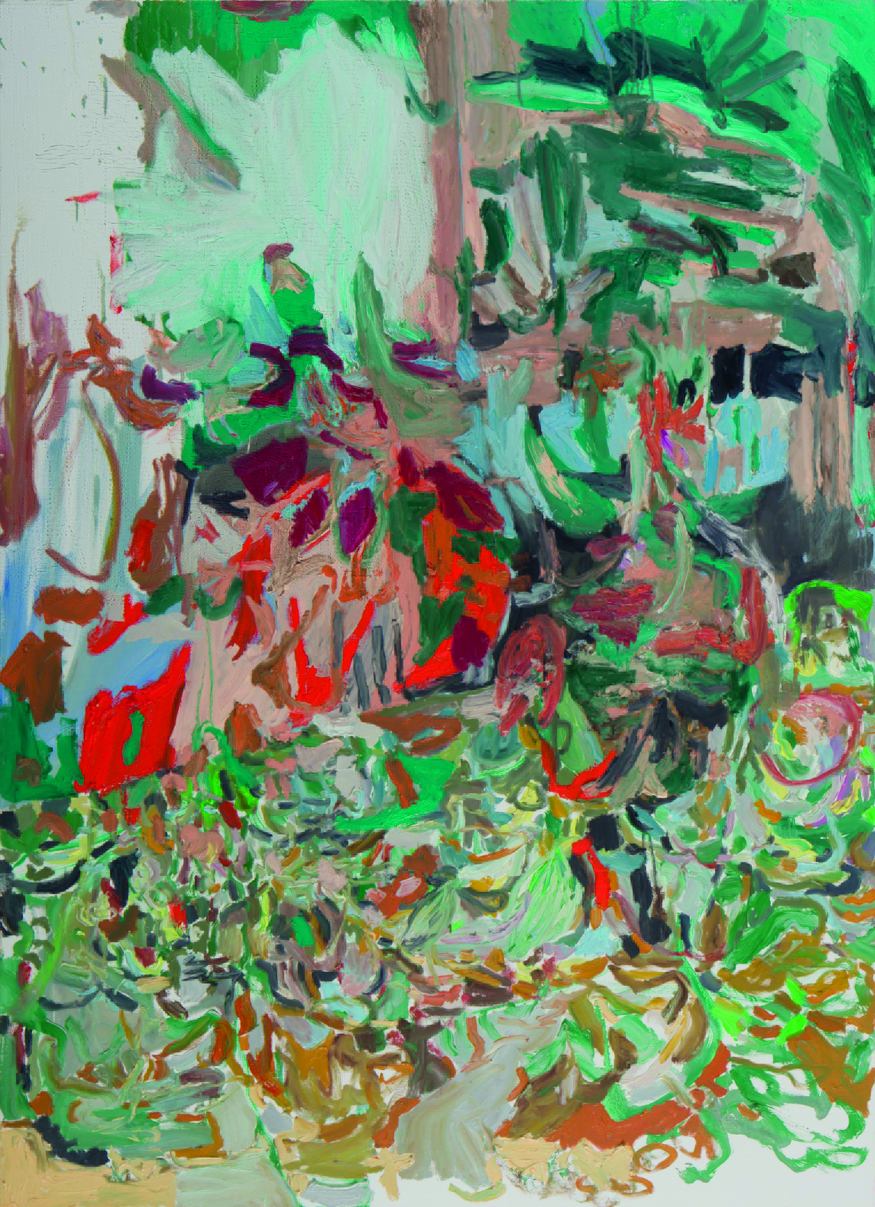 Indo por esse caminho, é redutor classificar sua pintura como “figurativa” ou “abstrata”, categorias que cada vez mais vão envelhecendo e se tornando limitantes. Existe figura ali. Povoam em suas composições, por vezes de grandes dimensões, resquícios de jardins, sacadas, arquiteturas, caminhos e pessoas. Mas gestos ambíguos, massas de tinta, traços, manchas e empastos aparecem para provar que é de pintura, e não de tema, que estamos falando. A configuração ali assumida, que pode nos soar familiar, é só uma possibilidade, um pretexto, um arranjo possível. E aí entra um ponto alto de sua poética: Mirela, como alguém que observa o mundo através da pintura, constrói sua pintura a partir daquilo que existe no mundo. Uma vista, um arranjo de mesa, um elemento arquitetônico, uma memória, uma música: todo estímulo sensorial interessante, por mais aleatório que possa nos soar, lhe serve de matéria prima. Uma lição que guarda com carinho é uma ensinada por sua mãe, que lhe orientava a organizar suas coisas e seu entorno por meio das: “cores que existem na natureza”.