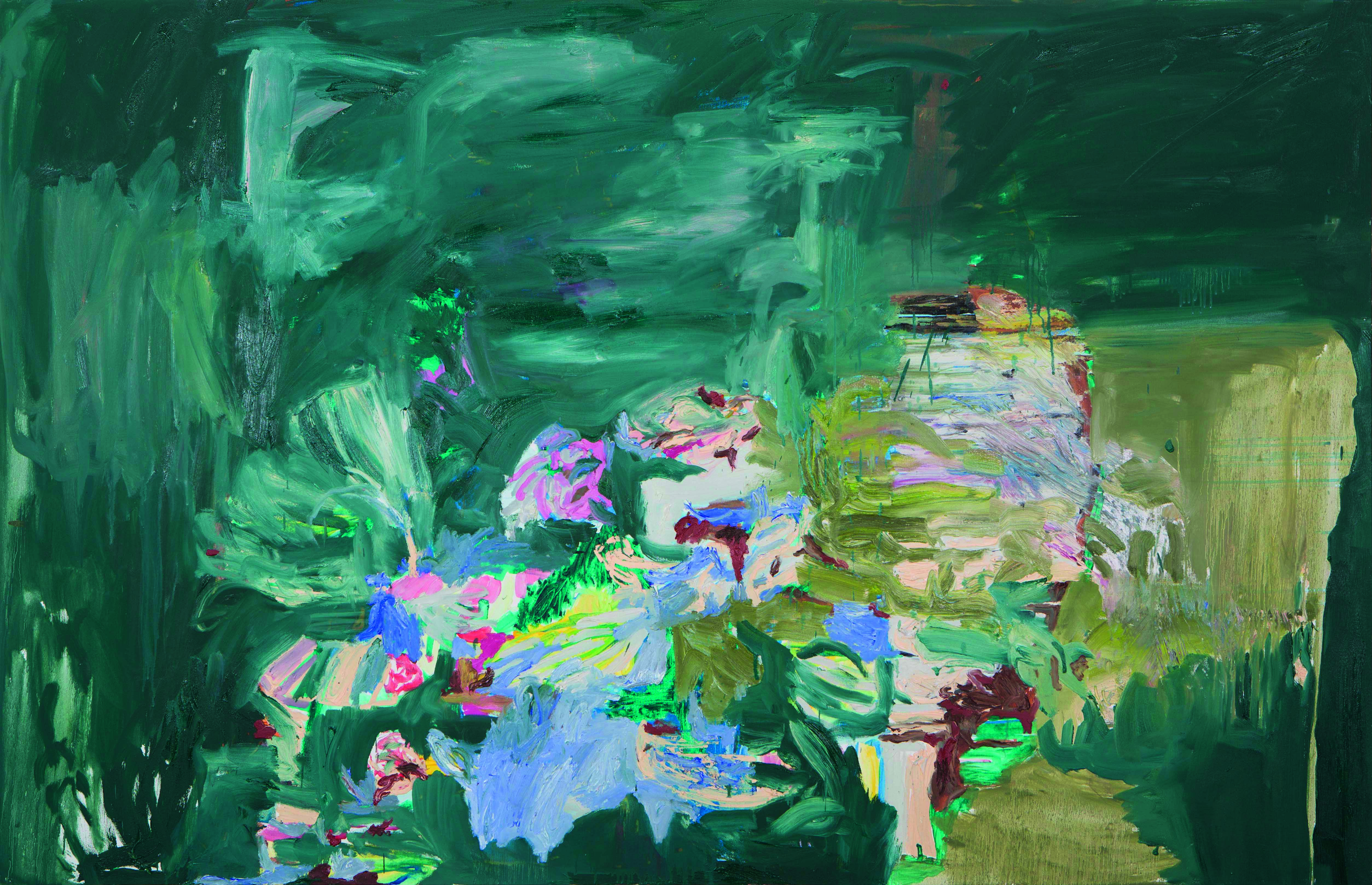 Dentro, fora apresenta um arranjo de verdes e amarelos de consistência úmida e brilho telúrico. O enquadramento tem algo de sufocante. Embora o título faça uma alusão a um lado de “fora”, os poucos rastros de azul claro que brotam na composição não parecem anunciar a saída de nada. Parecem enroscados em meio a um ramalhete denso de pigmento.