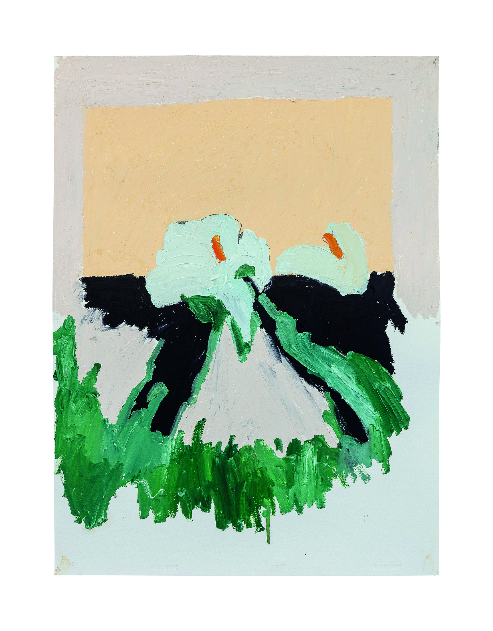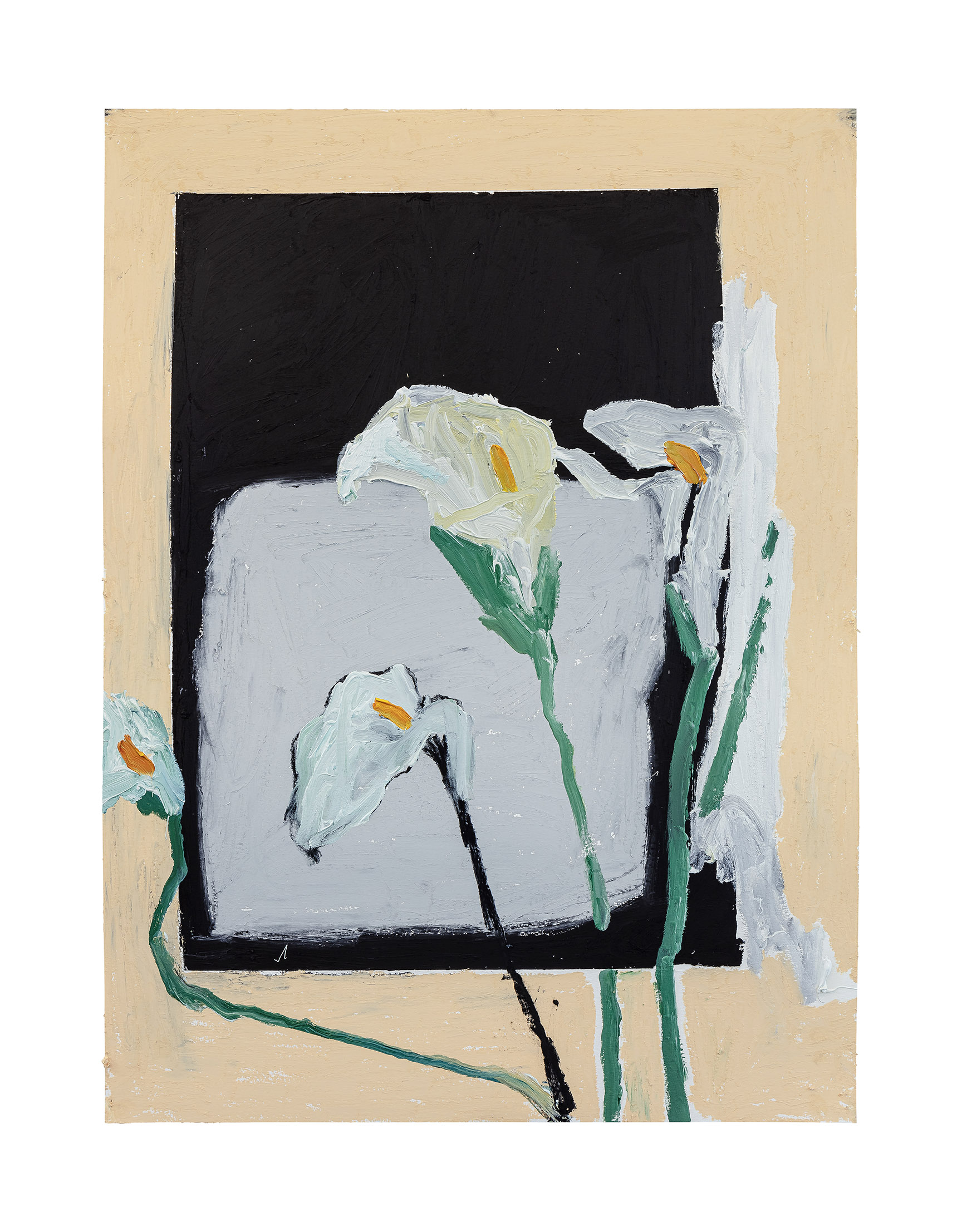 E aí chegamos as pinturas da segunda direção. A cor ainda comparece, mas perde um pouco de sua luminosidade. Muda a consistência também: o atmosférico de antes se converte em uma matéria úmida, pantanosa, densa. O colorido fica mais sóbrio, mais telúrico. As pinturas de antes parecem almejar o cósmico, o infinito, o numinoso. As dessa leva tem algo de cético: se sabem pinturas, e se pensam como tal. Chegada apresenta uma composição similar a de um arranjo floral, mas não são flores que brilham. Seus vermelhos e rosas tem algo de sanguíneo, visceral. Seus verdes mais transpiram do que respiram.