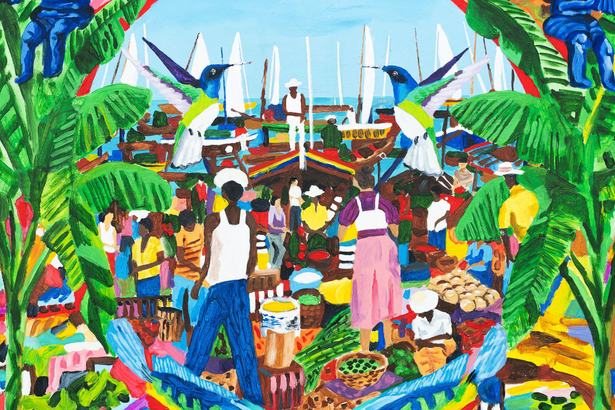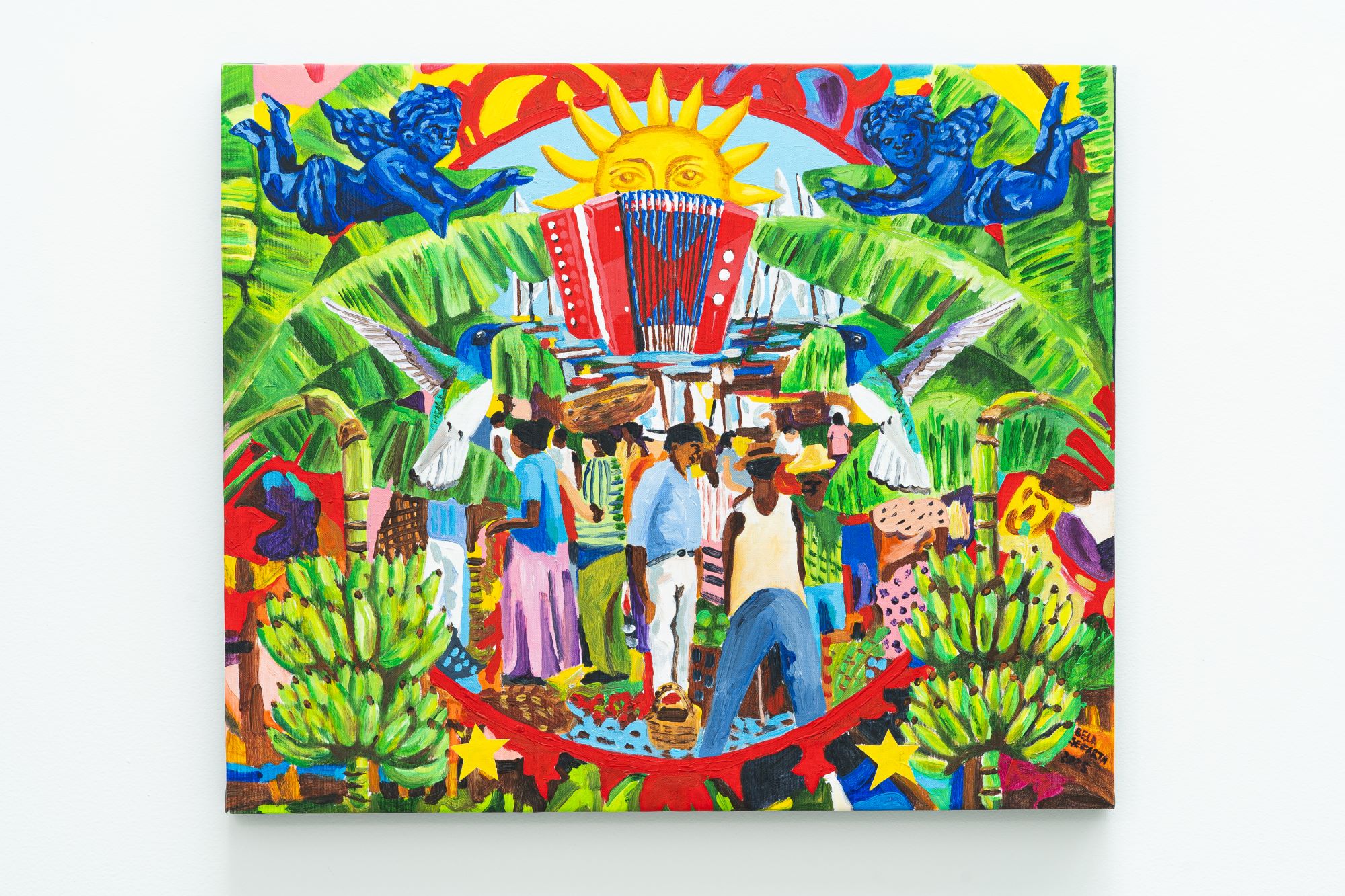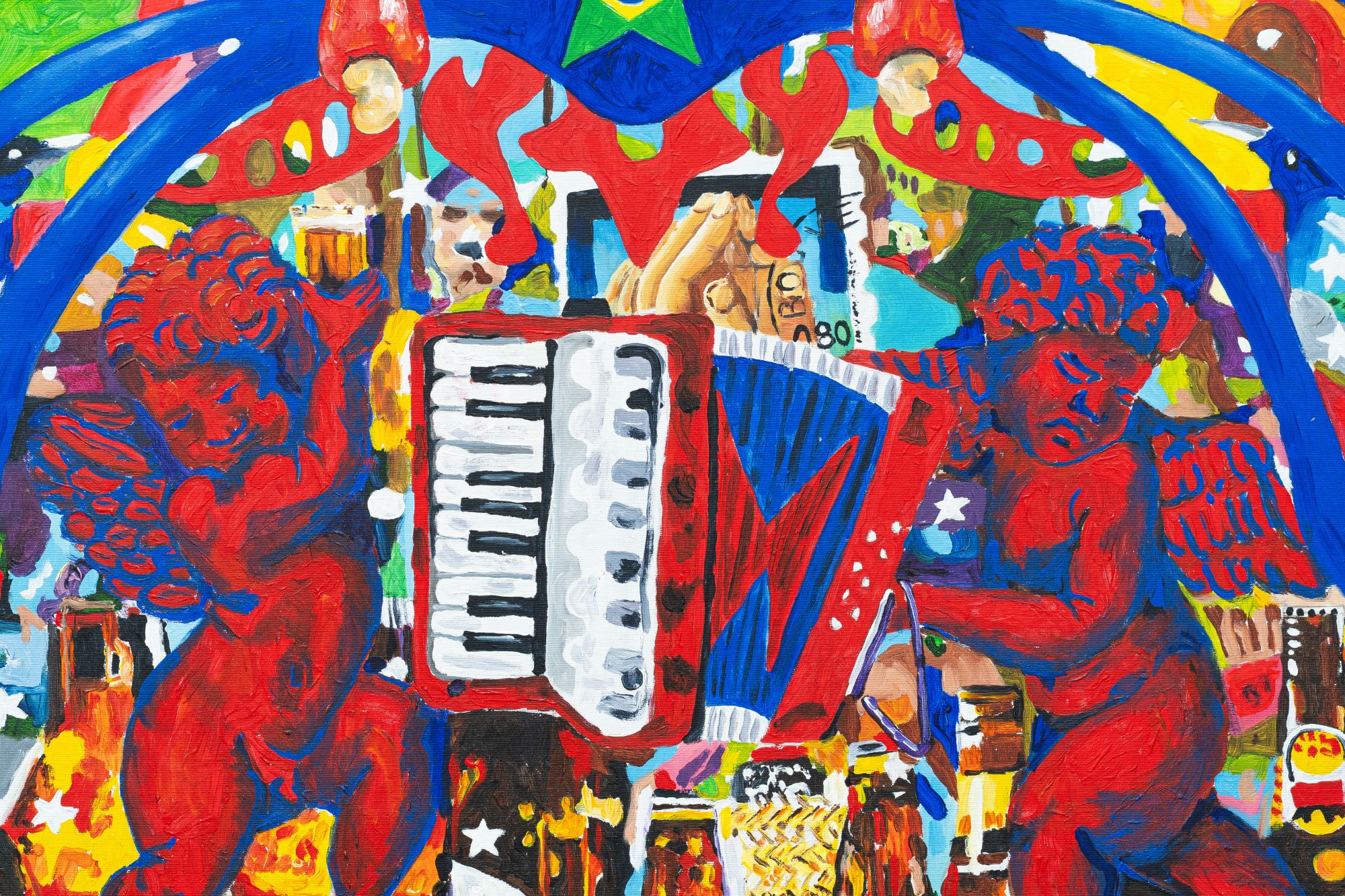 O acúmulo e o excesso de figuras, recorrentes em suas pinturas, não devem ser compreendidos como simples exuberância visual, mas como uma recusa ao silêncio e ao vazio. Nessa densa catalogação de personagens, objetos e cenas, a artista apresenta um repertório múltiplo, no qual o Barroco Baiano dialoga com a culinária do Recôncavo, com a cerveja gelada partilhada ao longo de um extenso calendário festivo e com a música, que se faz presente tanto pela imagem central da sanfona quanto pela representação discreta, de João Gomes, inserida em meio à multidão em uma das obras.
