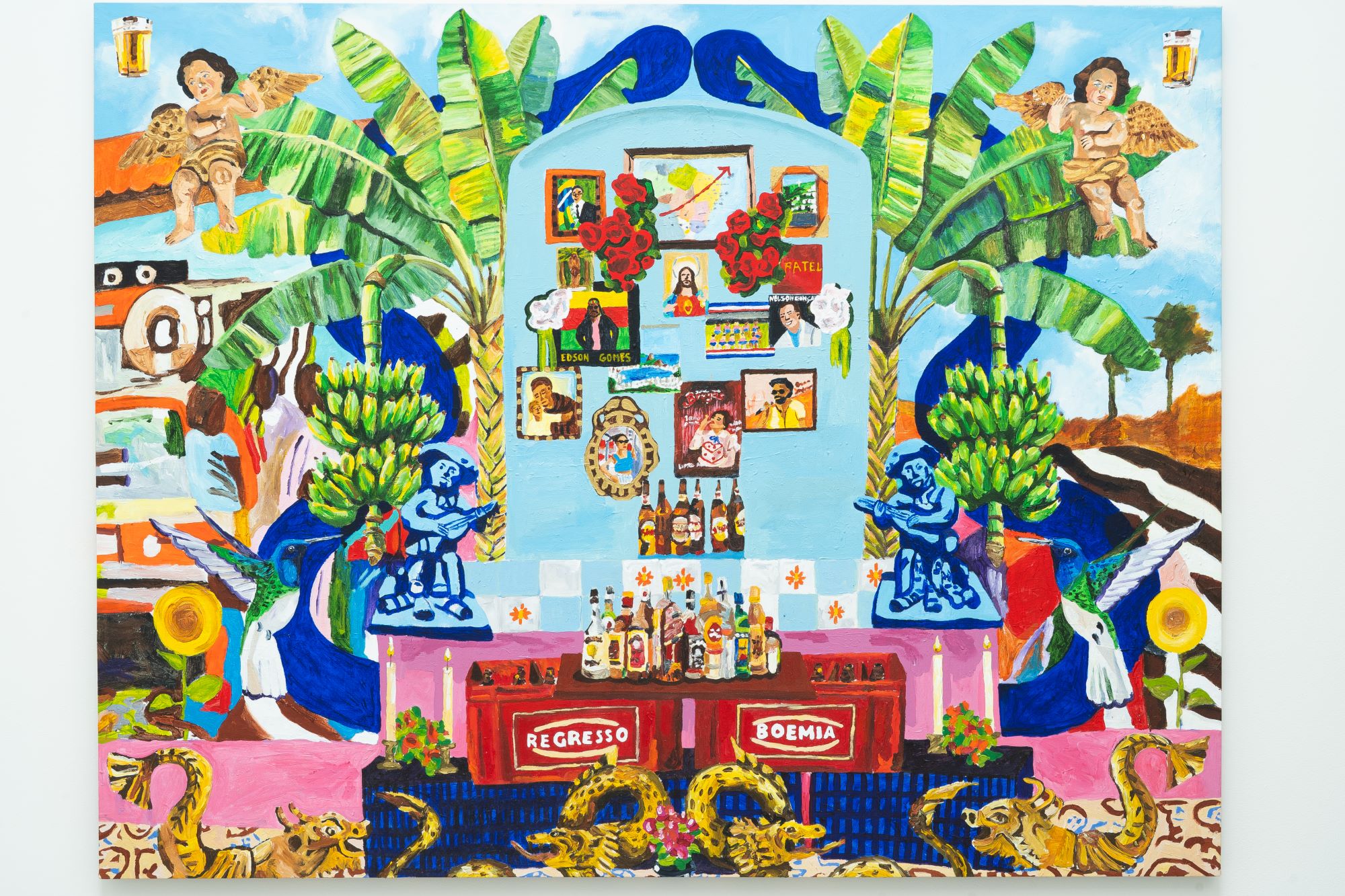Se Carybé elaborou uma síntese visual idealizada de uma ideia de povo da Bahia que se alastrou como a imagem predominante de baianidade, em Sol a pino, Isabela Seifarth desloca a síntese e a idealização, ao enfatizar a necessidade de observar os recortes culturais em sua pluralidade e colocá-los em relação. Suas obras evidenciam que o sincretismo religioso no Brasil não se restringe ao campo da espiritualidade, mas atravessa a cultura e os costumes, produzindo modos específicos de ocupação do espaço. O sincretismo[3] opera como um sistema dinâmico de coexistência simbólica, no qual diferentes matrizes culturais se articulam para sobreviverem no mesmo espaço. O acúmulo mostra-se como necessário, como parte da tradição. Esse convívio entre costumes e crenças rompe com a separação entre o público e o privado, fazendo das ruas a extensão da casa e do cotidiano um espaço permeado pelo rito. É nesse contexto que os altares surgem de forma recorrente nas obras, reunindo representações de santos católicos, orixás, querubins, obras que lembram Mestre Vitalino e ceramistas de Caruaru, retratos de entes queridos e objetos que também se inserem na liturgia sagrada como velas, ícones, bebidas alcoólicas e comida, configurando uma visualidade em que o sagrado se manifesta na experiência ordinária e compartilhada do território.