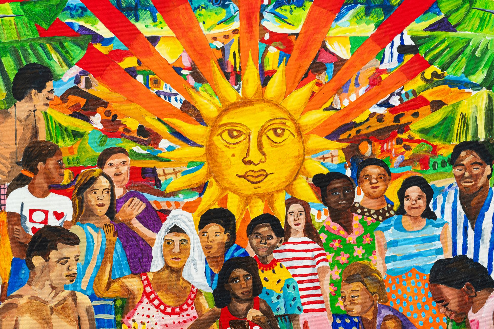 A mesa larga que se estende em conforto. Os corpos se aproximam em intimidade, espaço compartilhado, comunhão cotidiana e sagrada. Pães, frutas, pratos, copos e cerveja são o pretexto para o encontro. Ao centro, o sol antropomórfico observa a cena, vigilante, abençoando céu e mesa, natureza e gente. Aqui, o tempo desacelera, cadenciado, como no xote que guia nossa história. Uma ode à vida que saúda a existência.