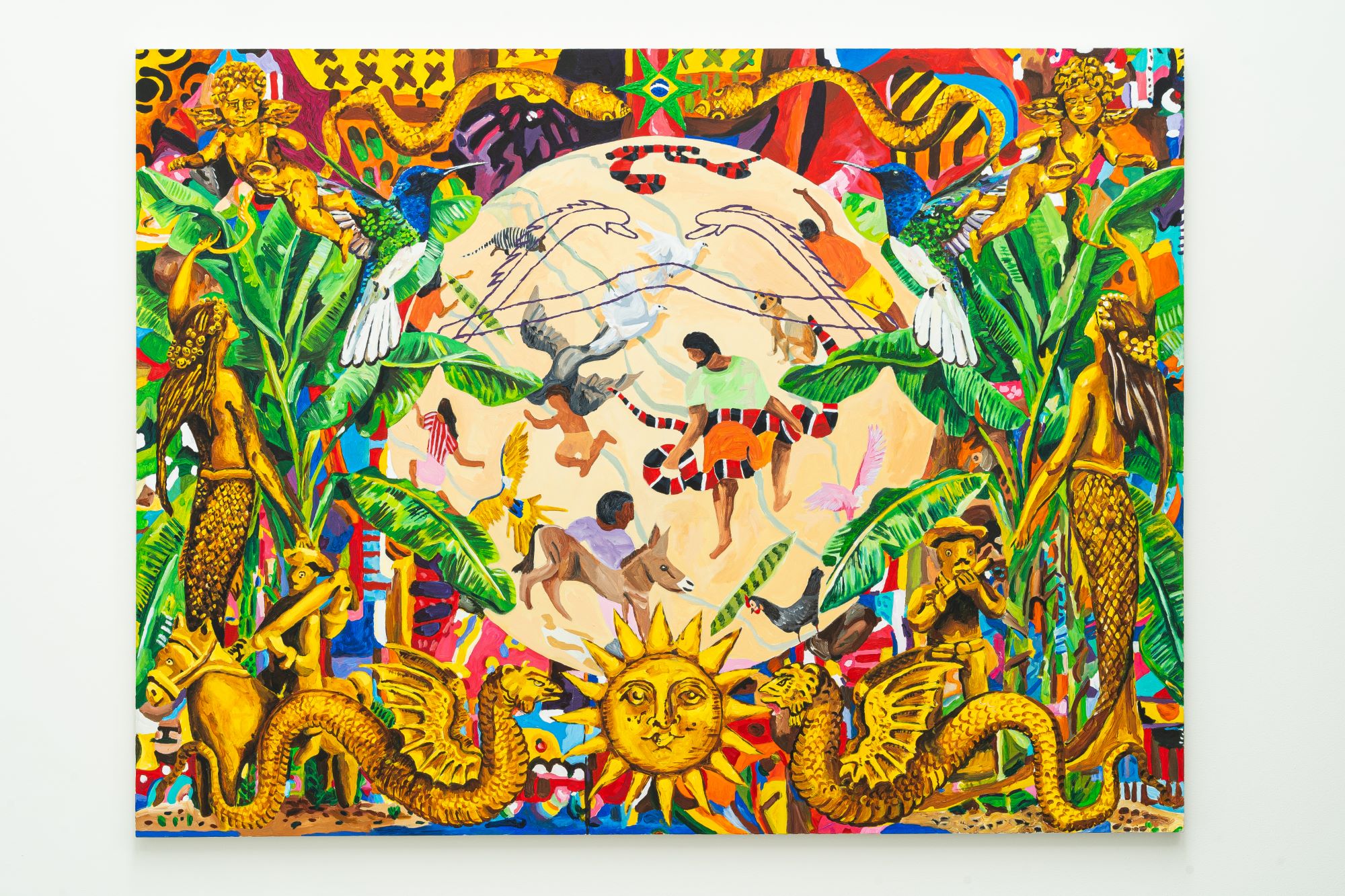 As figuras quiméricas que emergem nas pinturas operam como elementos fabulares, como lembranças de um passado que permanece ativo no território, manifestando-se por meio de imagens, gestos e práticas culturais que atravessam o tempo. Nesse sentido, esses elementos funcionam como marcas de uma memória coletiva que se atualiza continuamente, revelando a permanência de estruturas simbólicas na vida social. Por exemplo, a figura do sol, que está presente em quase todas as obras, funcionava como referencial nos mapas para a navegação. O sol nessas terras é sempre bem-vindo, companheiro e testemunha das histórias que nascem. Outro elemento recorrente é a estrela nas cores verde e amarelo, demarcando o território com uma bandeira do Brasil.